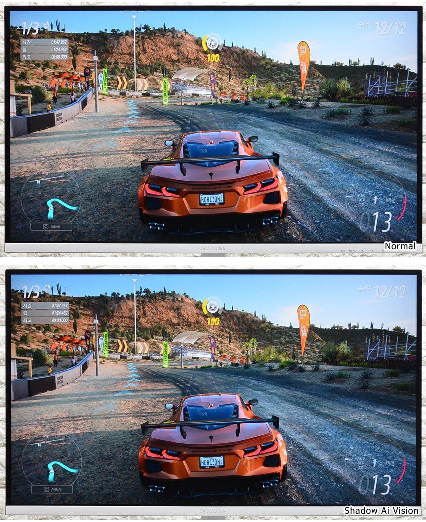 새도우 Ai 비전 기술이 적용되어 게임등에서 유용하게 활용할 수 있다. 밝기를 높여 암부 시인성을 개선하는 블랙레벨과 달리 과도하게 밝거나 이질적인 부분을 자연스럽게 조절하고 디테일을 개선해 영상 퀄리티를 높여주는 것을 확인할 수 있었다.
