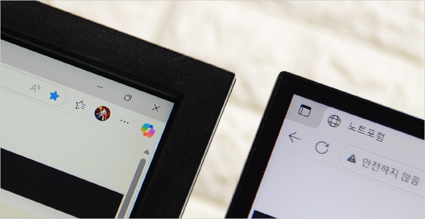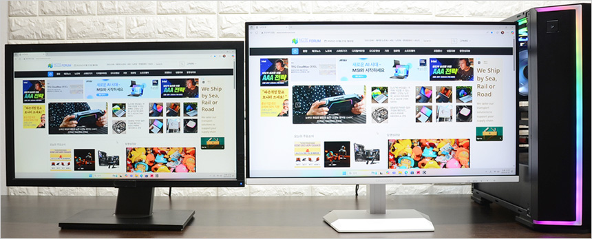 2대의 모니터를 셋팅한 김에 베젤 두께를 확인하고 있는 모습으로 확연한 차이를 보여주었다. 슬림 베젤이 적용된 모델로 높은 몰입감을 경험할 수 있을 것이다.
