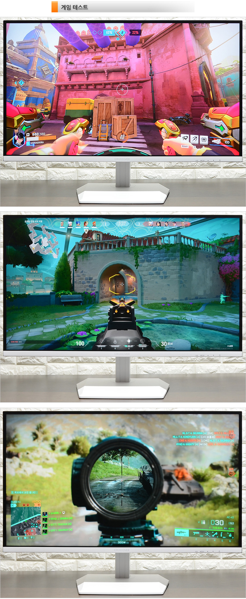 FPS 게임 발로란트와 오버워치2, 배틀필드 2042를 이용해 게임 테스트를 진행하고 있는 모습으로 180Hz 주사율과 0.5ms 응답속도를 지원하는 고성능 게이밍 모니터답게 빠른 움직임에서도 부드러운 영상을 선사해 높은 구분감을 경험할 수 있었으며 끊키거나 잔상이 남아 눈이 피로하고 어지러운 일반 모니터와 달리 장시간 게임을 즐겼음에도 피로감이 크지 않았다.