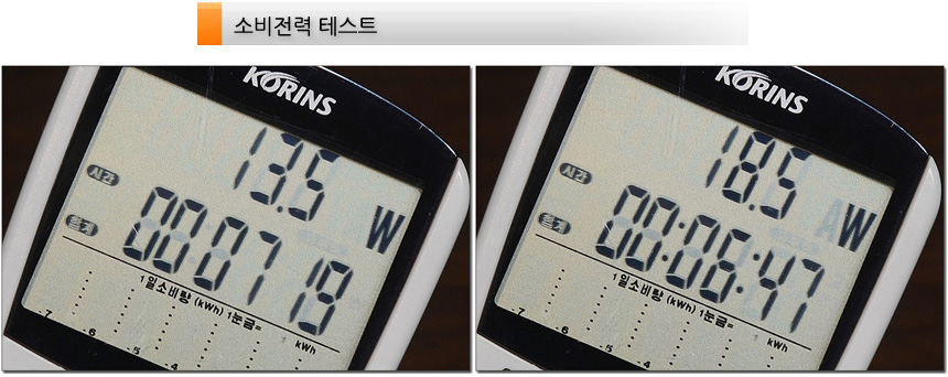 소비전력 테스트를 진행하고 있는 모습으로 대기모드에서는 0.5W, 50% 밝기에서 13.5W, 100% 밝기에서 18.5W 의 전력이 소비되는 것을 확인할 수 있었다. (전기세 걱정없이 사용할 수 있을 것이다.)