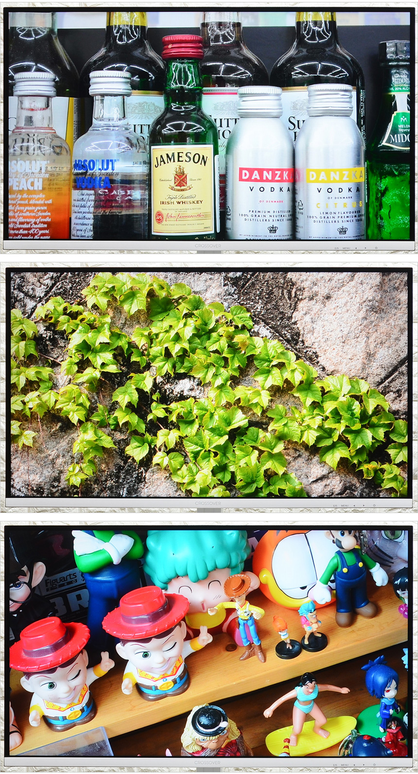 테스트 프로그램을 이용해 화질을 확인하고 있는 모습으로 IPS 패널 특유의 진한 색표현이 인상적이다. (VA 패널과는 분명한 차이를 느낄 수 있었다.) 특히 특정 원색 (레드) 이 튀는 느낌을 주는 구형 IPS 패널과 달리 원색이 지나치게 강렬하지 않은점이 마음에 든다. 게이밍에 특화된 모니터 지만 화질이 상당히 뛰어나기 때문에 심플한 디자인 작업도 편하게 실행할 수 있다. 또한 대부분의 IPS 패널 모니터와 같이 1,000 :1 의 명암비를 지원한다. 상단의 그레이스케일 차트는 완벽하게 구분할 수 있었다.
