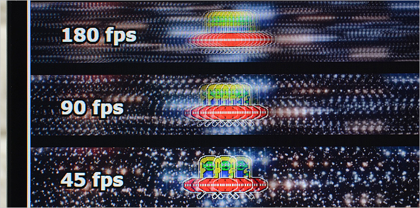 상단의 사진은 180Hz 의 높은 주사율을 쉽게 확인할 수 있도록 하위 프레임과 같이 재생되는 영상 (960 Pixel Per Sec) 을 셔터스피드 1/20 로 촬영한 모습으로 프레임이 낮을수록 캐릭터의 수가 적으며 프레임이 높아질수록 시간당 많은 화면이 뿌려지기 때문에 캐릭터의 수가 많은 것을 확인할 수 있다. 직접 눈으로 영상을 볼 경우 180Hz 의 경우 훨씬 자연스럽게 UFO 가 이동한다.