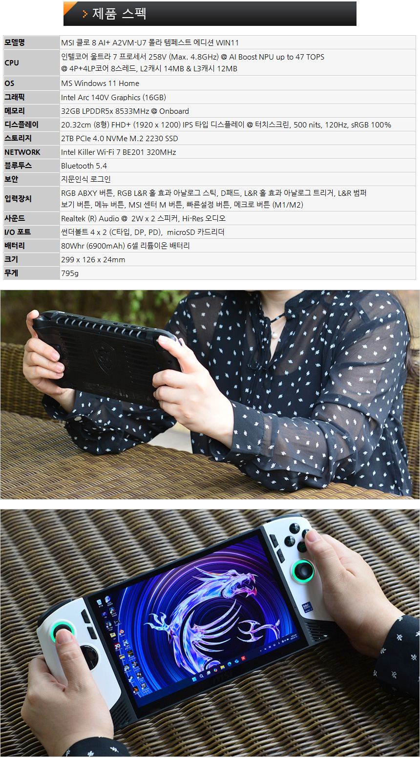 2TB SSD 지원 하이엔드 게이밍 UMPC, MSI 클로 8 AI+ A2VM-U7 폴라 템페스트 에디션 WIN11