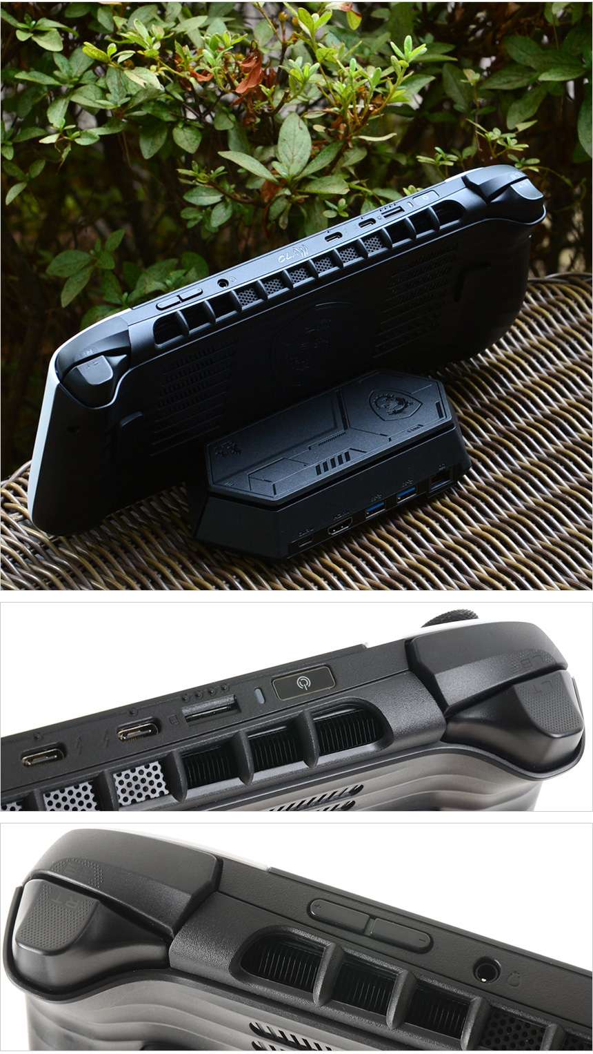 기기 상단부의 모습으로 양 측면에 범퍼와 트리거가 설치되어 있다. (상단에서 언급한 것과 같이 물리적 접촉이 발생하지 않는 홀효과 트리거를 적용했다.) 또한 중앙에는 통풍구가 설치되어 있고 볼륨조정 버튼과 오디오 (COMBO) 단자, 저장용량을 늘릴 수 있는 microSD 카드리더 등을 제공한다. 또한 전원 버튼은 쉽게 눌리지 않도록 튀어나오지 않도록 설계했으며 지문인식 센서를 내장해 보안성을 높였다. 뿐만 아니라 두 개의 썬더볼트 4 단자를 지원해 빠른 데이터 전송은 물론 다양한 주변기기 연결이 가능하다.