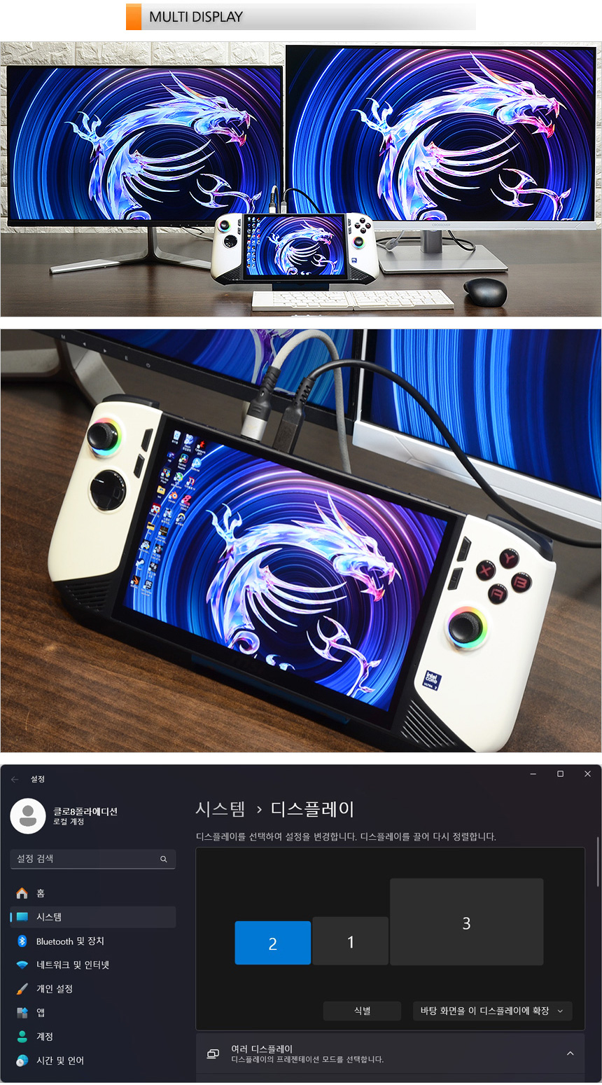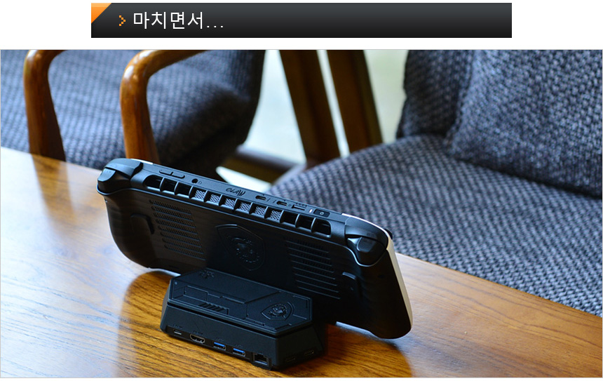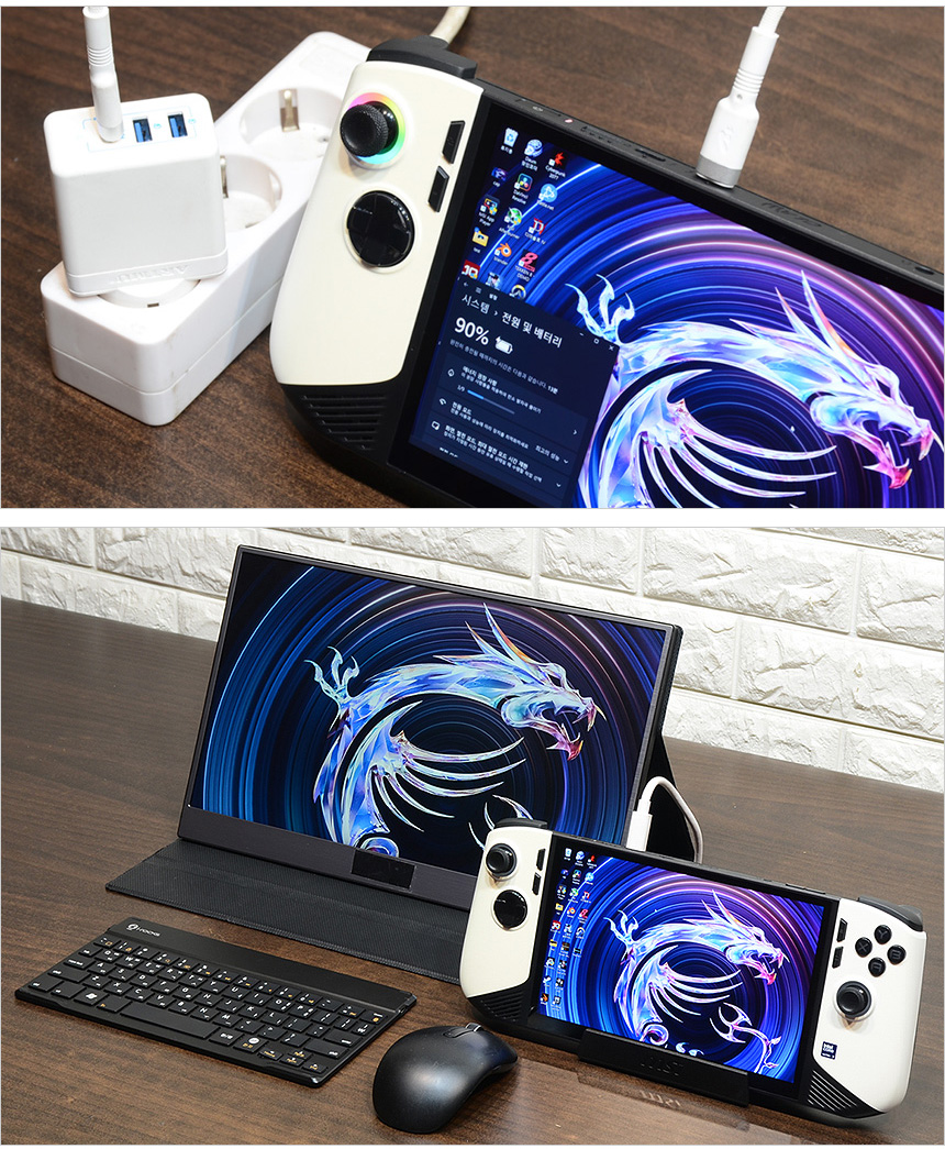 이 제품은 최상급 루나레이크 프로세서를 탑재한 제품으로 노트북이나 PC 대용으로 활용할 수 있다. 특히 2개의 썬더볼트 4 단자를 지원해 전원 뿐만 아니라 키보드나 마우스와 같은 주변기기도 편하게 연결할 수 있게 되었다. (전작에서는 허브를 필수적으로 사용해야만 했다.) 상단의 사진은 포터블 모니터와 연결한 모습으로 손쉽게 PC로 변신시킬 수 있었다. @ 자리를 옮겨가며 작업하는 하이브리드 업무 환경이나 출장, 파견등에서도 유용하게 사용할 수 있다.