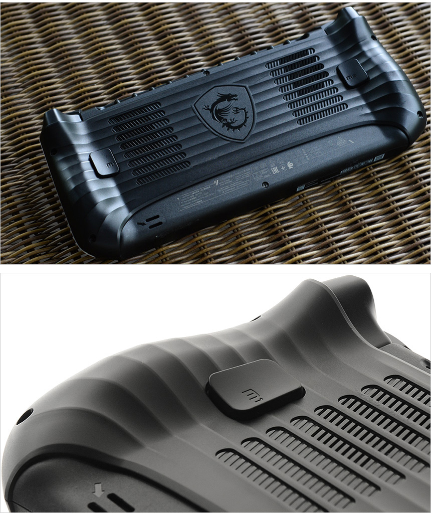 바닥면의 모습으로 원활한 공기 유입을 위해 팬이 설치된 중앙 양 측면에 통풍구가 설치되어 있고 그립감을 높이기 위해 깊은 굴곡이 형성된 것을 확인할 수 있다. 또한 편하게 게임을 즐길 수 있도록 2개의 매크로 키를 제공한다.
