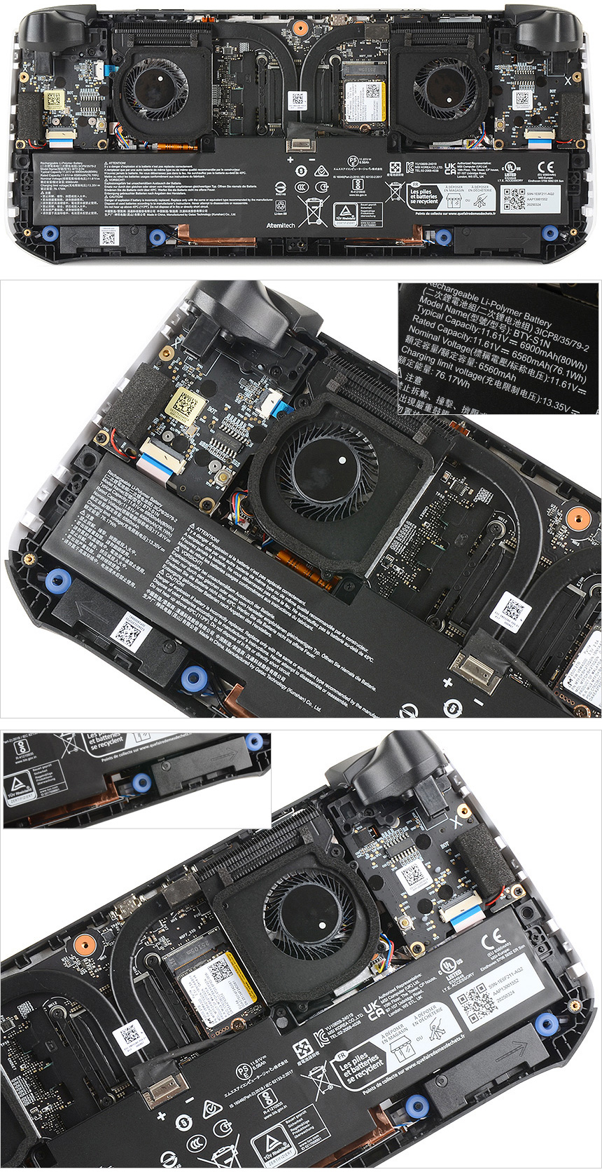 제품 내부의 모습으로 열을 효과적으로 식혀줄 수 있도록 듀얼팬과 히트파이프가 장착된 것을 확인할 수 있으며 (쿨러부스트 하이퍼플로우 기술이 적용되어 열을 빠르게 식혀주고 팬소음을 최소화 했다.) 하단에는 6900mAh 대용량 배터리가 설치된 것을 확인할 수 있다. 또한 32GB LPDDR5X 메모리가 빌트인 되어 있으며 스피커와 WI-Fi 안테나가 하단에 설치된 것도 눈에 띈다.