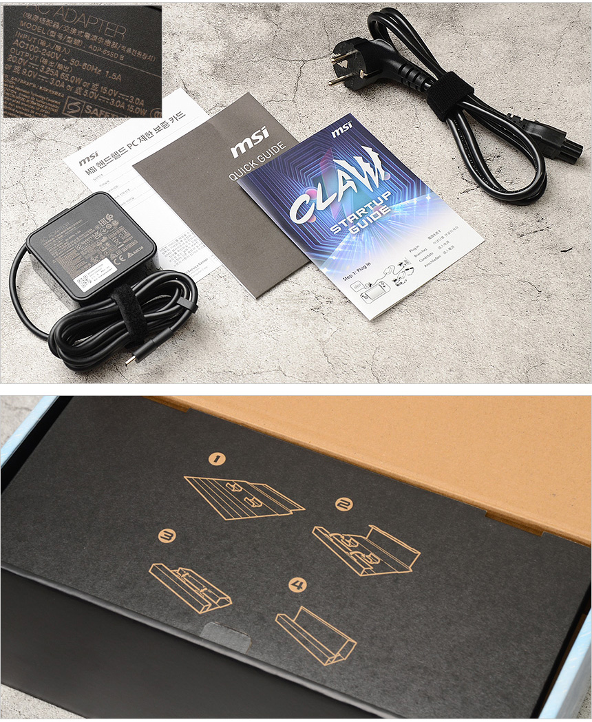 풀KIT 의 모습으로 본체를 비롯해 퀵 매뉴얼과 보증서가 제공되며 (제품의 A/S 는 MSI 공식 서비스센터에서 진행한다.) C타입의 65W 전원 어댑터와 전원 케이블이 포함되어 있다.
