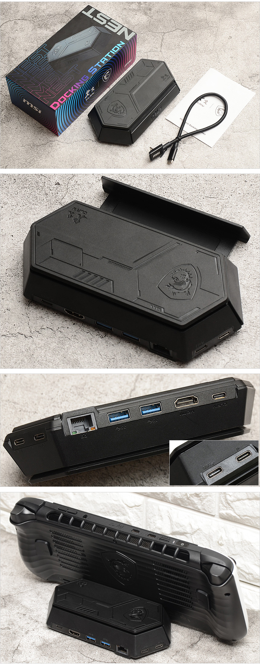 별도로 판매되는 도킹 스테이션을 사용하면 더 편하게 기기를 사용할 수 있다. 기본적으로 스탠드 기능을 제공하며 다양한 단자를 지원해 집이나 사무실 등에서 PC용도로 활용할 때 특히 유용하게 활용할 수 있다. (연결을 위한 케이블이 별도로 제공되어 클로 뿐만 아니라 시중에서 판매되는 게이밍 UMPC 대부분과 호환된다.)