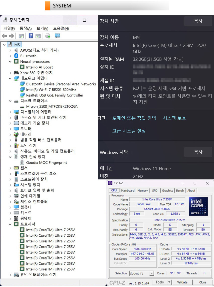 시스템 정보를 확인하고 있는 모습으로 전력 효율성을 높인 인텔코어 울트라 7 258V 프로세서가 탑재된 것을 확인할 수 있다. 16GB 비디오 메모리 활용이 가능한 인텔아크 140V 내장그래픽을 지원해 하위 라인업과는 분명한 3D 성능차를 경험할 수 있으며 NPU를 기본 지원해 코파일럿을 비롯한 다양한 AI 프로그램을 부드럽게 사용할 수 있다.