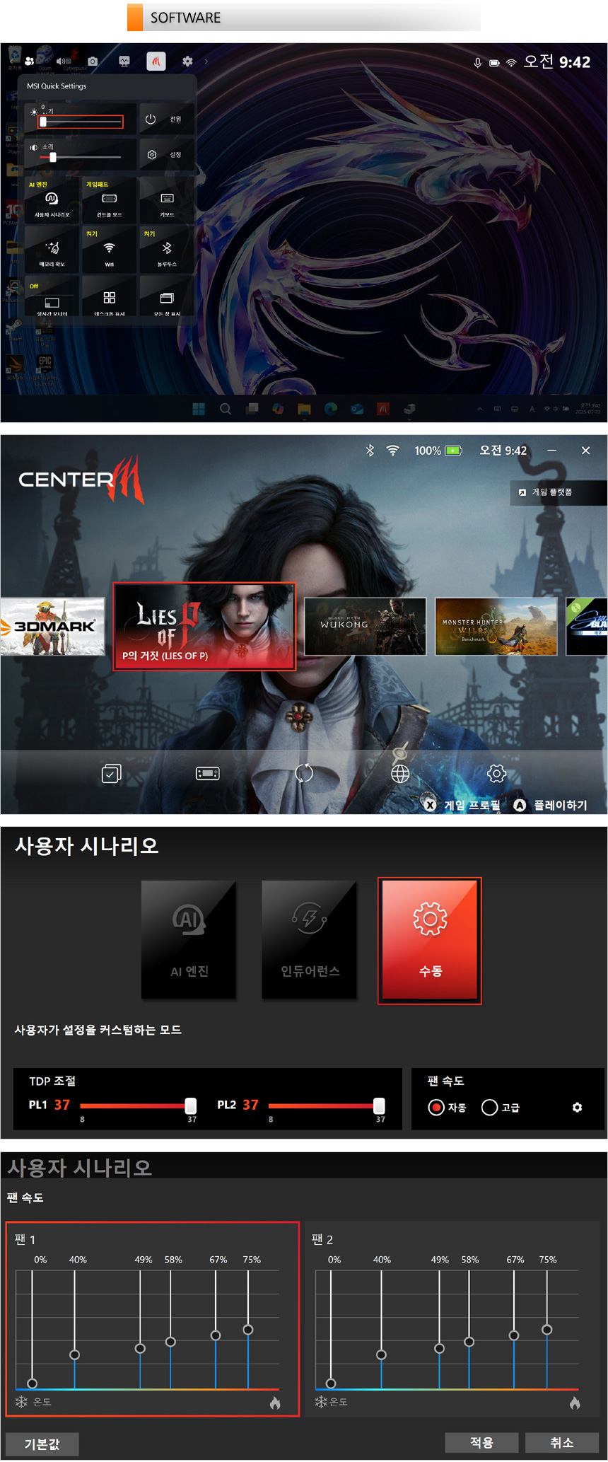 사용자 시나리오는 자동으로 사용환경을 분석해 최적의 성능으로 작동하는 AI 엔진을 비롯해 배터리 소모를 최소화 하는 인듀어런스를 지원하며 수동 모드를 제공해 사용자가 TDP와 팬속도를 조절할 수 있다. (수동 모드에서 37W를 TDP를 높일 수 있다. 더 강력한 성능을 경험할 수 있을 것이다.)