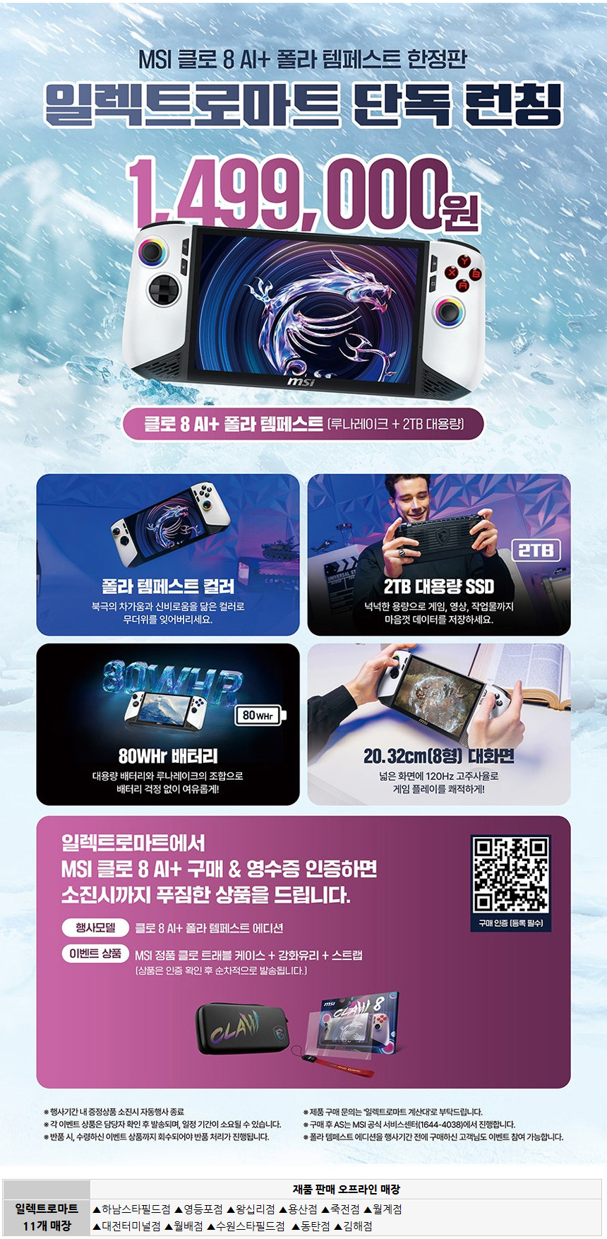 온라인에서 판매되는 대부분의 기기들과 달리 MSI 클로 8 AI+ A2VM-U7 폴라 템페스트 에디션 WIN11 은 한정판 모델로 오프라인 에서만 구입이 가능하다. 접근성이 뛰어난 일렉트로마트 11개 매장에서 현재 제품을 판매하고 있어 편하게 구입할 수 있다. 현재 선착순 이벤트를 진행하고 있어 제품 구입시 정품 파우치와 디스플레이 보호를 위한 강화유리, 스트랩 등을 증정하고 있다. 이점 참조하기 바란다.