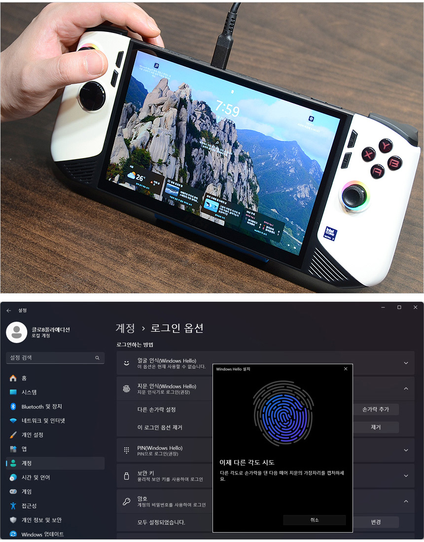 지문인식 센서를 장착해 보안성과 편의성을 높였다. 설정-계정에 있는 로그온 옵션에서 윈도우즈 헬로를 사용할 수 있으며 지문을 등록해 빠른 로그인이 가능하다. 높은 보안이 요구되는 외부에서 편하게 사용할 수 있을 것이다.
