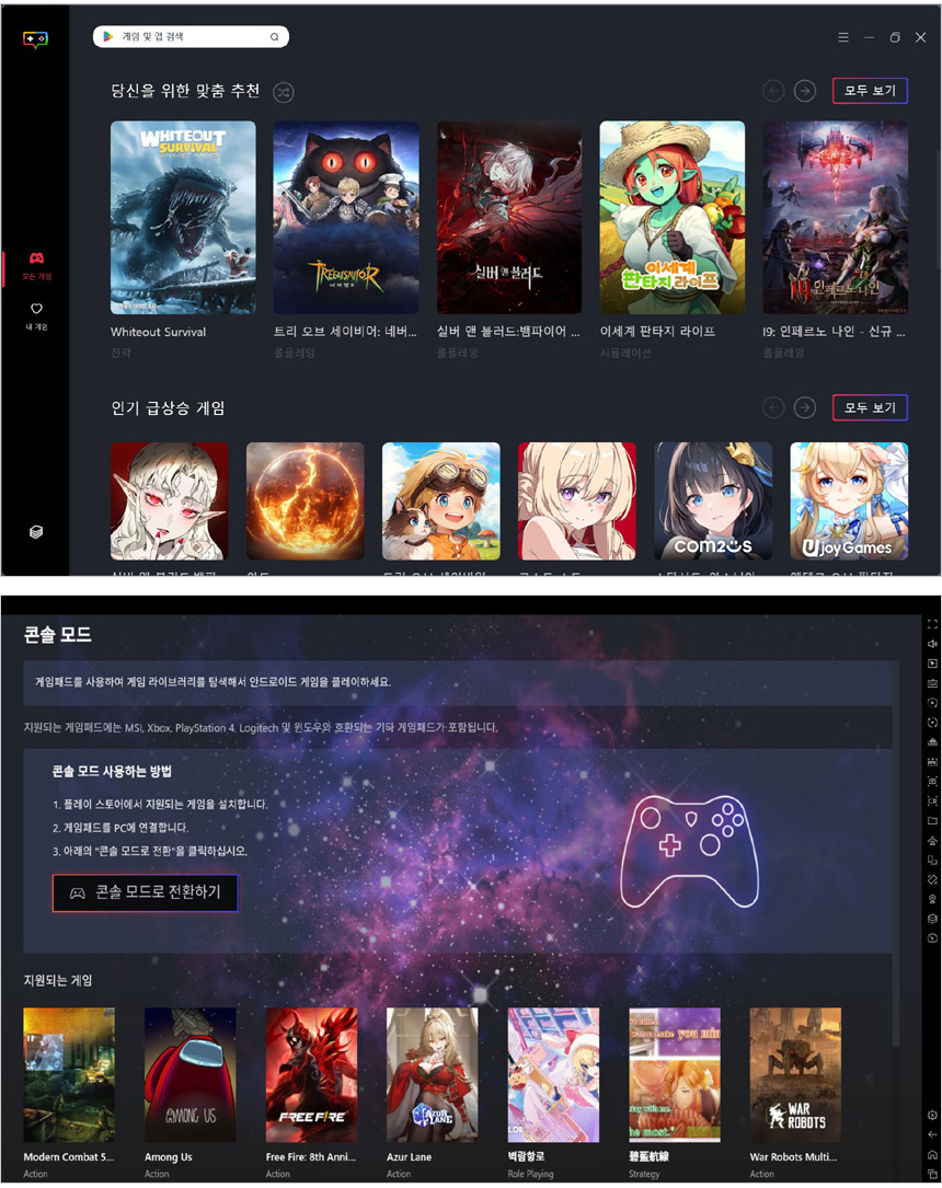 MSI 앱 플레이어를 사용하면 모바일 게임도 즐길 수 있다. 키맵핑이 완료된 게임의 경우 별다른 설정없이 패드를 사용해 즐길 수 있으며 일부 유명 게임은 콘솔모드로 전환 후 원활하게 플레이 할 수 있었다. (지원되지 않는 게임의 경우 스마트폰과 같이 터치로 게임을 즐길 수 있다.)