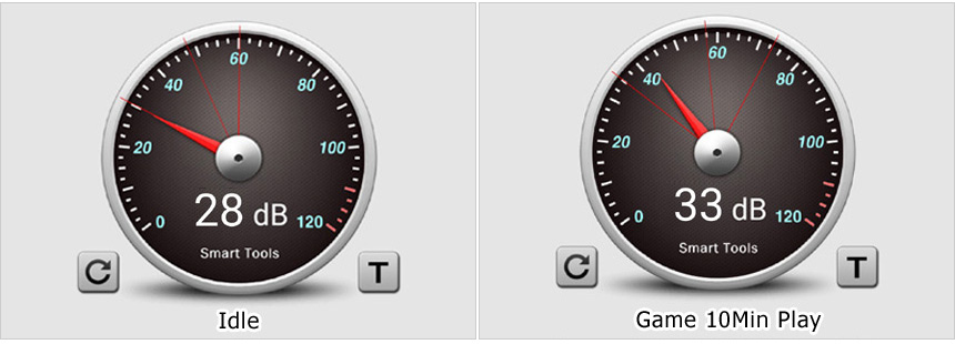 팬소음 테스트도 진행했는데 아이들이나 캐주얼한 작업에서는 생활소음에 묻혀 팬소음이 거의 들리지 않았으며 게임을 실행하면 듀얼팬이 빠르게 동작해 팬소음이 커지기는 했지만 크게 신경쓰이는 수준은 아니었다. (개인적으로 가장 마음에 드는 부분이다. 듀얼팬을 탑재했음에도 게임 실행중 상당히 정숙했다.) @ 측정값은 순수한 팬소음이 아니고 팬소음을 포함한 사무실의 생활 소음이다. 이점 참조 바란다.