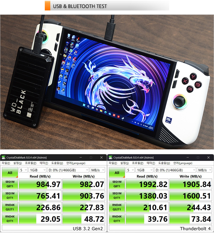 썬더볼트 4 단자를 지원해 고속 데이터 전송이 가능하다. 상단의 사진은 외장 SSD (USB 3.2 Gen2x2 지원제품) 를 이용해 테스트를 진행하고 있는 모습으로 USB 3.2 Gen2와 확연한 차이를 보여주었다. 대용량 데이터 전송이 잦은 유저들이라면 만족하며 사용할 수 있을 것이다.