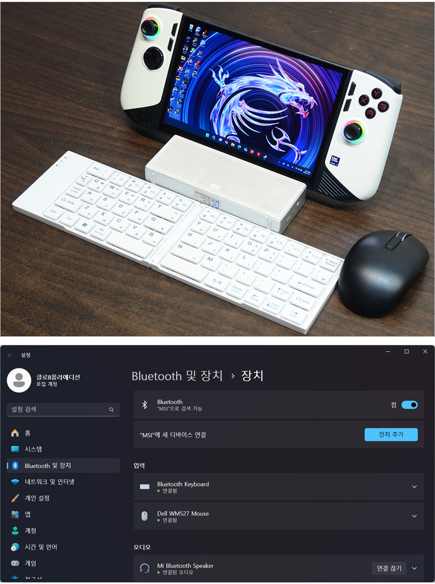 블루투스를 지원해 주변기기를 무선으로 연결해 활용할 수 있다. 상단의 사진은 외장 스피커와 키보드, 마우스를 이용해 페어링 테스트를 진행하고 있는 모습으로 원활하게 연결되는 것을 확인할 수 있었다.