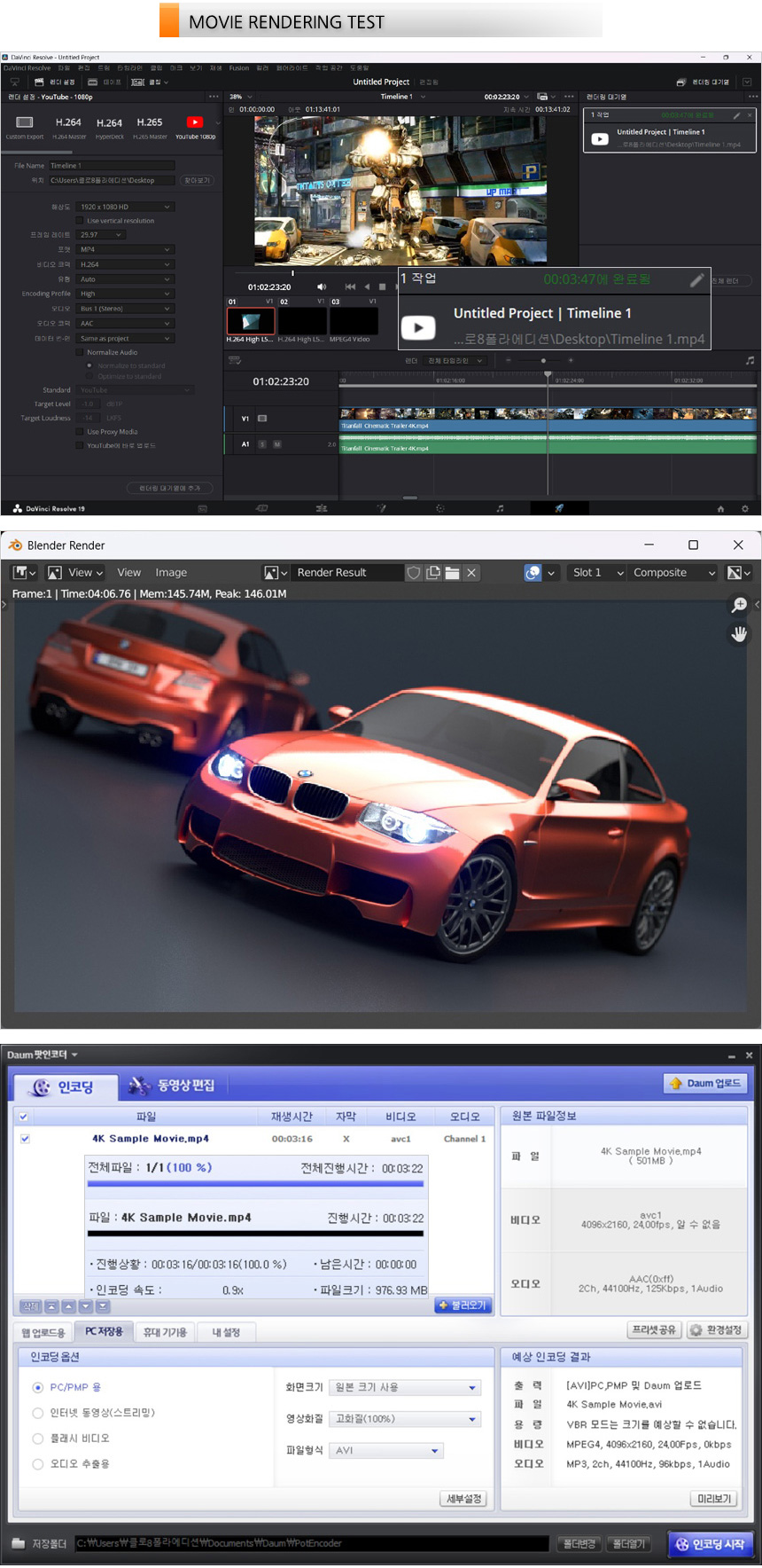 영상편집 S/W 다빈치 리졸브를 이용해 랜더링 테스트를 진행하고 있는 모습으로 (640MB, 920MB, 990MB 4K 동영상을 단일 동영상으로 랜더링, FHD 해상도에 H.264 비디오 코덱) 3분 47초가 소요되는 것을 확인할 수 있었으며 블랜더 랜더링 테스트에서는 4분대의 빠른 랜더링 시간을 보여주었다. 또한 4K 동영상의 인코딩을 진행했을 때 3분 22초의 빠른 인코딩 시간을 보여주었다. (최상급 루나레이트 탑재 모델로 구형 게이밍 노트북 수준의 빠른 영상편집 랜더링 속도를 보여주었다. 작업용으로도 유용하게 사용할 수 있을 것이다.)