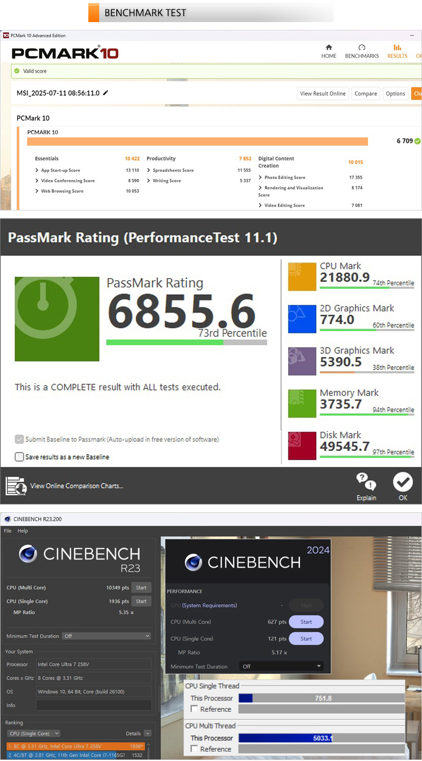 벤치마크 테스트를 진행하고 있는 모습으로 문서작업 뿐만 아니라 고성능을 필요로 하는 전문작업용 S/W도 부드럽게 실행할 수 있는 스코어를 보여주었다.