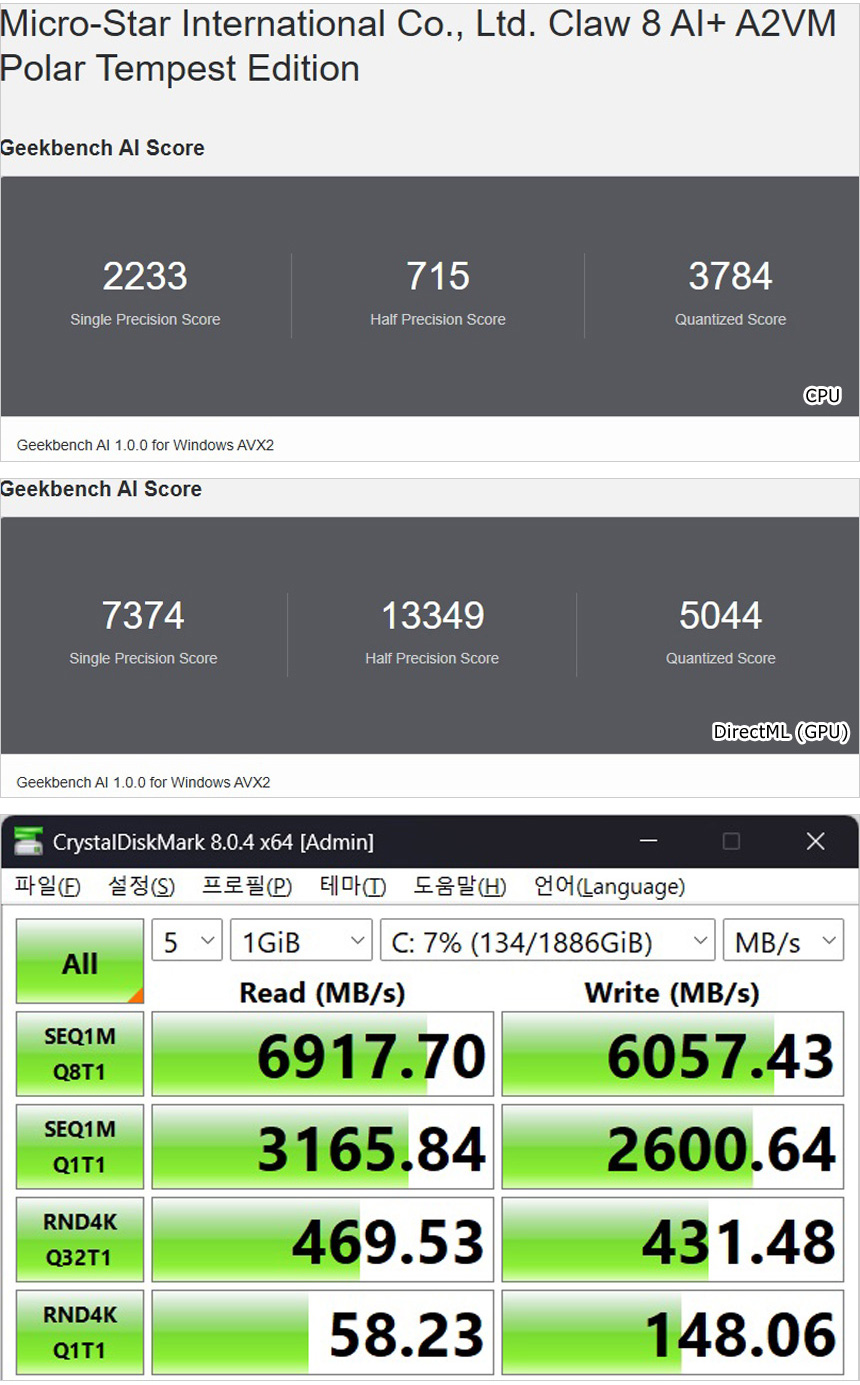 긱벤치 AI를 이용해 AI 성능을 확인해 보았는데 루나레이크가 탑재된 프리미엄 슬림 노트북들과 비교해도 떨어지지 않는 높은 스코어를 보여주었다. 또한 저장장치의 속도를 확인하고 있는 모습으로 PCIe 4.0 NVMe SSD를 탑재해 빠른 속도를 경험할 수 있다. 특히 2TB 대용량을 지원해 최신 게임을 여유롭게 설치할 수 있다.
