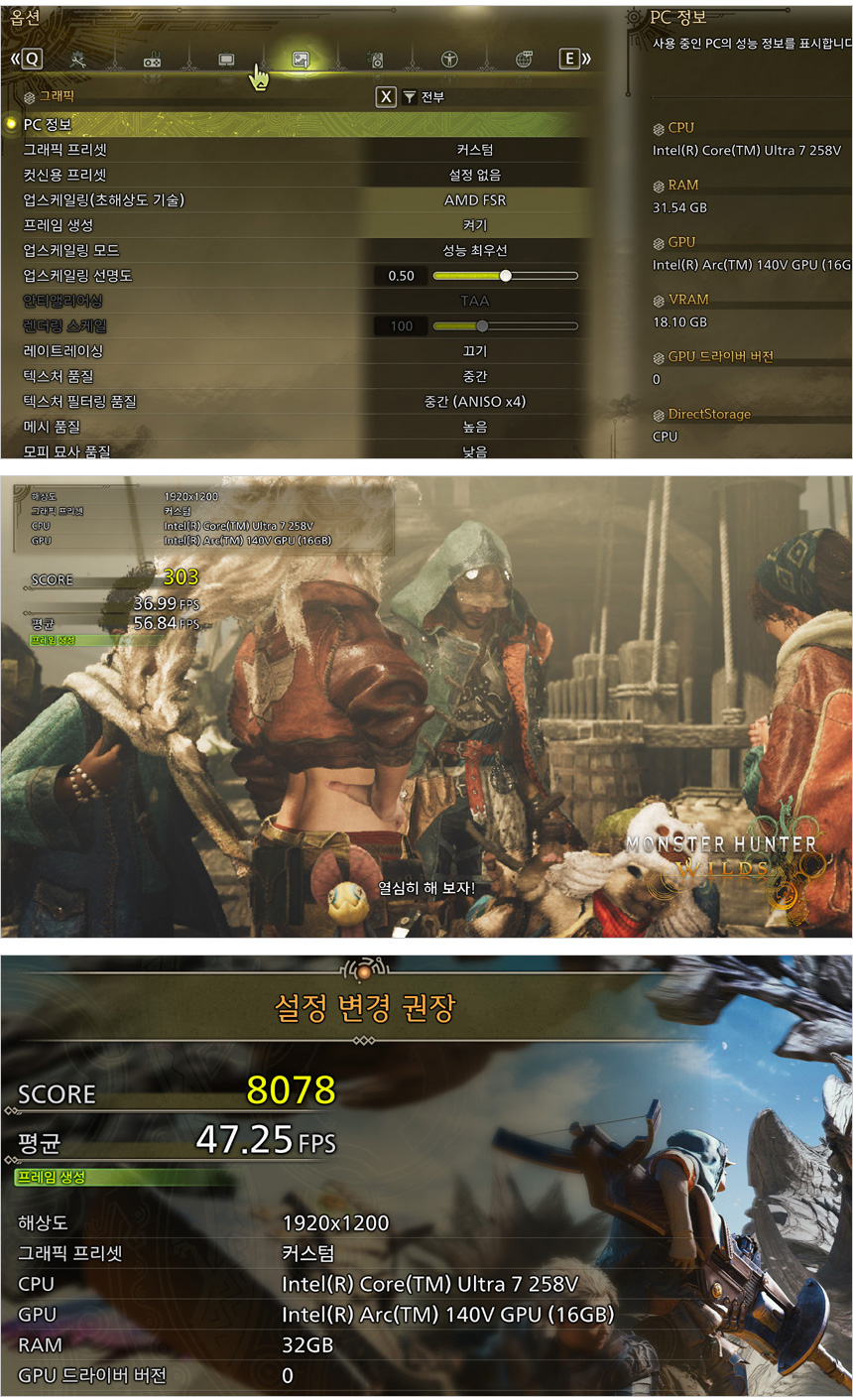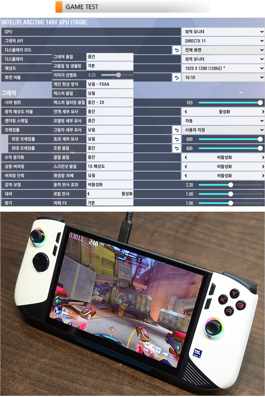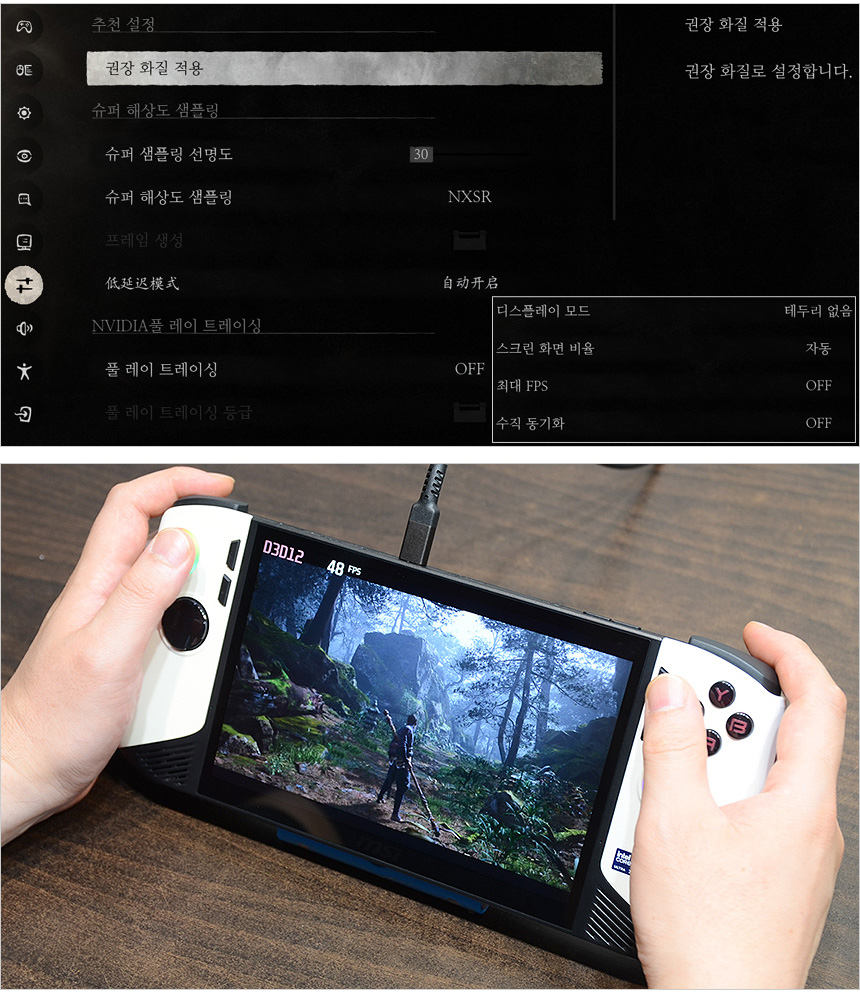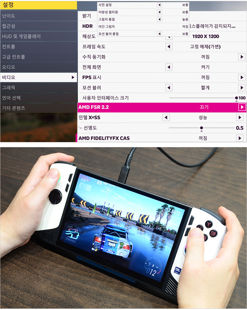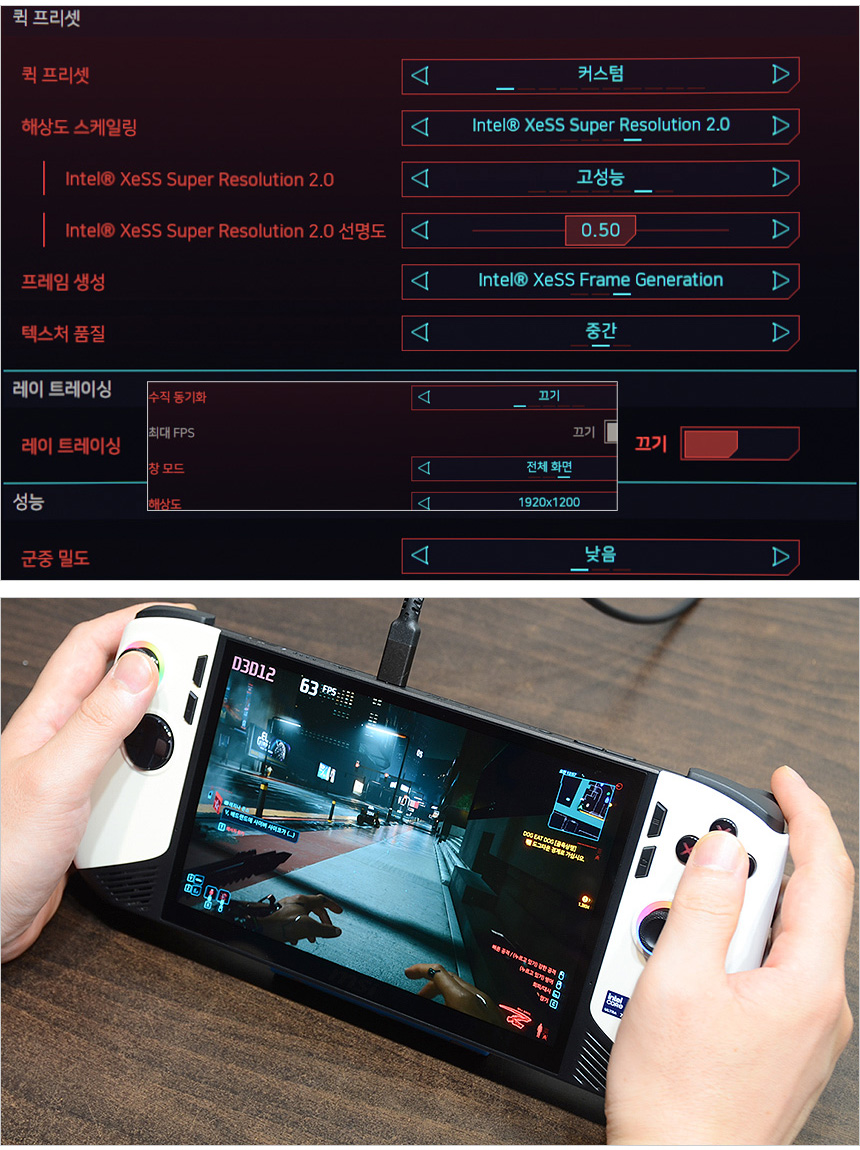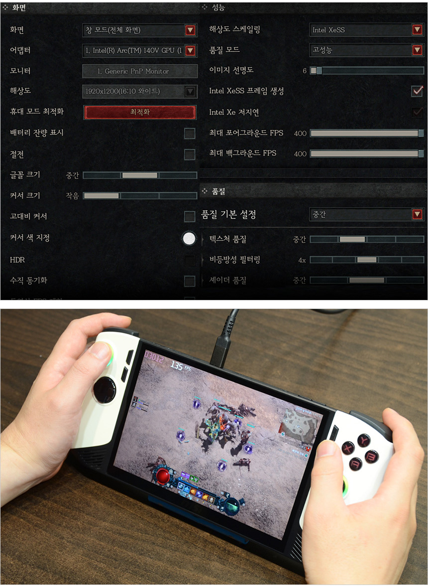 참고로 많은 게임들이 핸드헬드에서 더 부드럽게 게임을 즐길 수 있도록 옵션을 추가하고 있다. 스텔라 블레이드의 경우 핸드헬드 전용 프리셋을 제공하고 디아블로 4는 XeSS에서 프레임 생성 기능을 추가해 전작대비 높은 프레임으로 게임을 즐길 수 있었다. 또한 이 제품은 인텔의 XeSS 업스케일링 기술을 지원하지만 AMD 의 FSR 기술도 활용할 수 있어 게임에 따라 업스케일링 기술을 변경해 성능 향상을 꾀할 수 있다. FSR만 사용해야 하는 AMD 프로세서 모델대비 장점이라 할 수 있다.