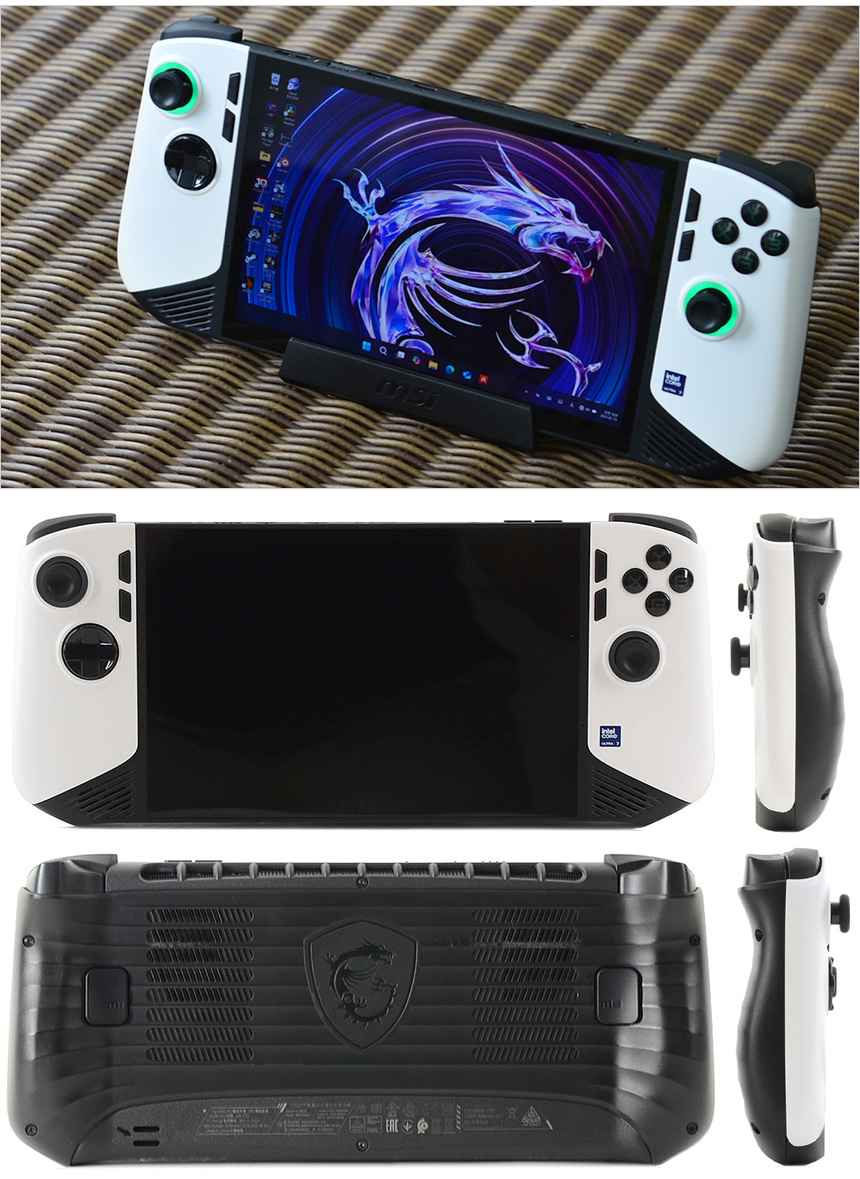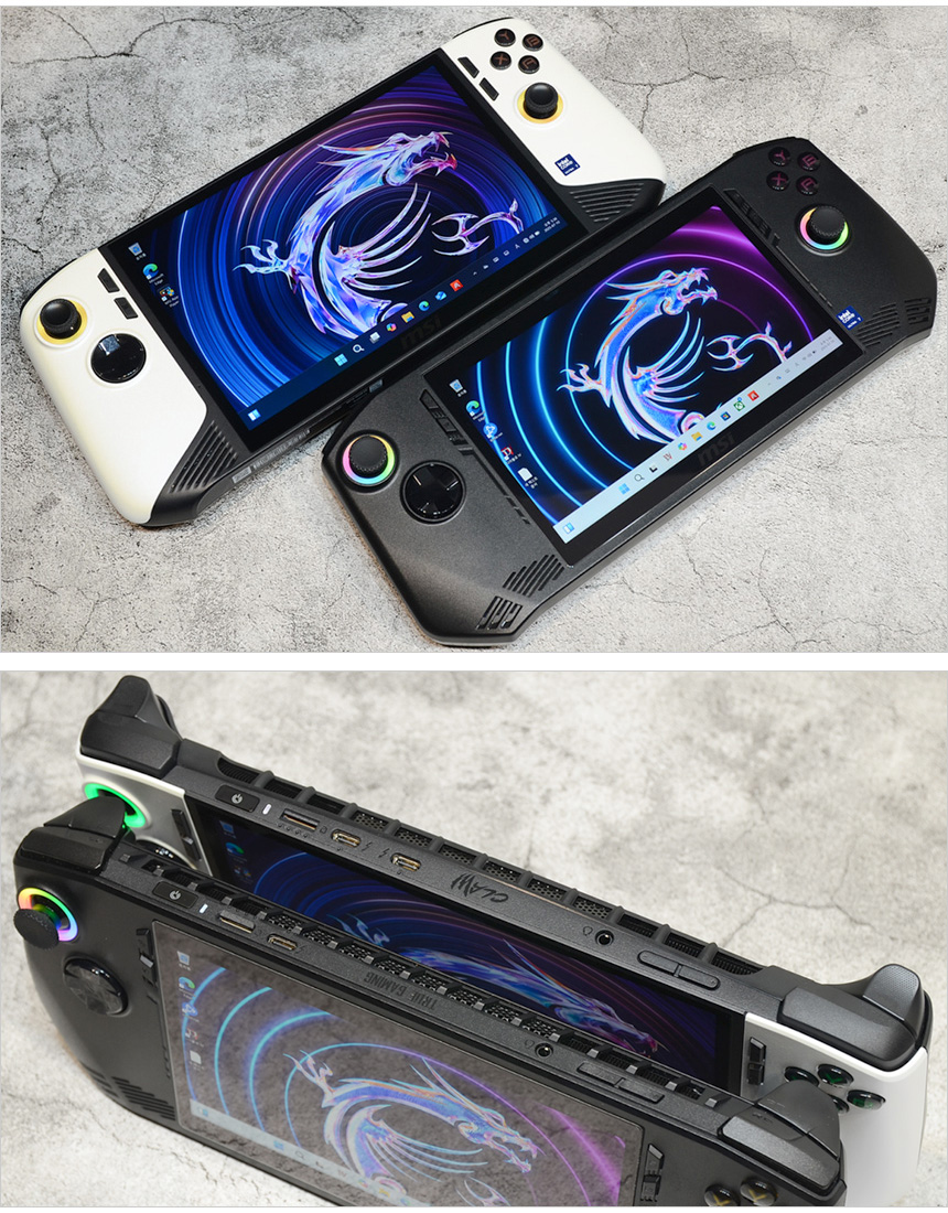메테오레이크가 탑재된 MSI 클로 A1M-U7와 크기 & 디자인을 비교하고 있는 모습으로 차이가 분명한 것을 확인할 수 있다. 16:10 비율의 8형 FHD+ 디스플레이를 사용해 시원시원한 영상을 즐길 수 있으며 (7형 모델대비 화면크기는 1형 커진것에 불과하지만 세로가 긴 16:10 비율을 적용해 실제로 보면 훨씬 커보인다.) 하나의 썬더볼트 4 단자를 지원해 주변기기 연결에 어려움을 느낄 수밖에 없었던 전작과 달리 2개의 썬더볼트 4 단자를 제공해 허브를 사용하지 않고 편하게 주변기기를 연결할 수 있게 되었다. (물론 성능에서도 큰 차이를 보여준다.)