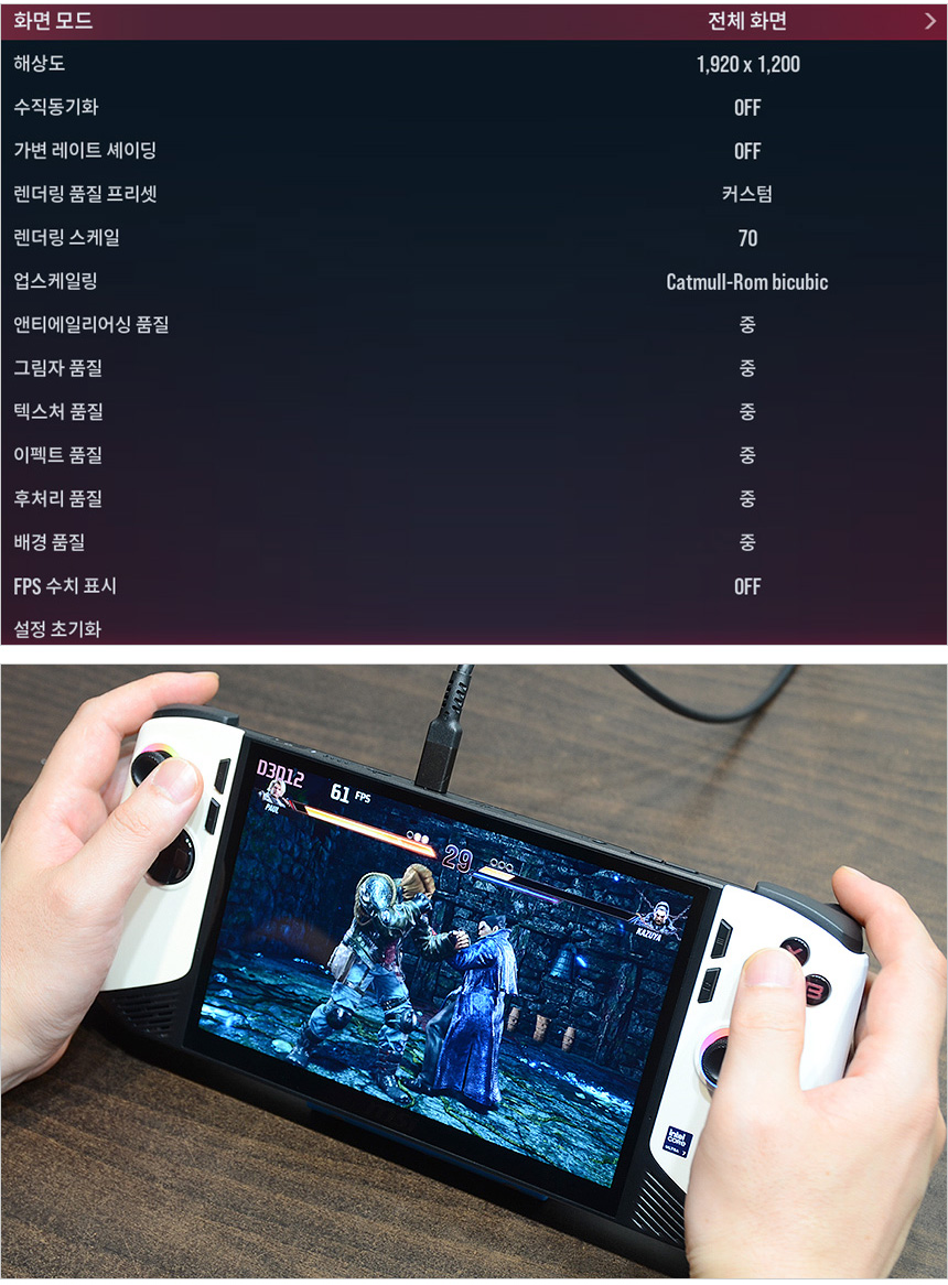 TEKKEN 8을 플레이 하고 있는 모습으로 중간 옵션에서 57-61 프레임을 보여주어 부드럽게 게임을 즐길 수 있었다. (업스케일링 모드에 따라 프레임이 달라진다. 처음에는 FSR를 적용했는데 프레임이 낮은 듯 해 Catmull-Rom bicubic 로 변경해 주니 프레임이 확연히 높아졌다.