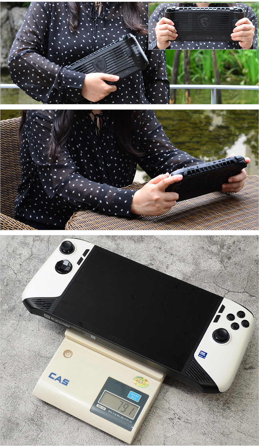 8형 대화면을 지원하는 모델로 7형 모델들과 크기 차이가 느껴졌다. 단, 무게가 가벼운 편이며 인체공학적 디자인을 적용해 편하게 손에 들고 어디서나 게임을 즐길 수 있다. 특히 동급 최강의 긴 배터리 사용시간을 보여주며 PD충전도 지원해 배터리 걱정없이 사용할 수 있는점은 차별화된 장점이라 할 수 있다.