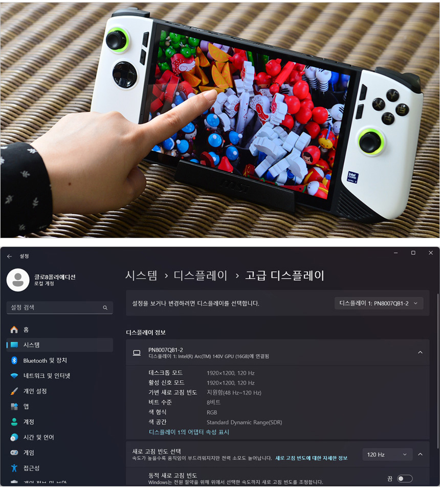 게이밍에 특화된 모델답게 120Hz 주사율을 지원하는 것도 확인할 수 있었다. 최근 출시되는 스마트폰이 90Hz 나 120Hz를 지원하는 것은 특유의 부드러운 화면 전환 때문이다. 이 제품도 60Hz 지원 제품들과는 확연히 다른 부드러움을 경험할 수 있다. (상황에 따라 주사율이 조정되는 동적 주사율 설정도 가능해 배터리 소모를 최소화 할 수 있다.)