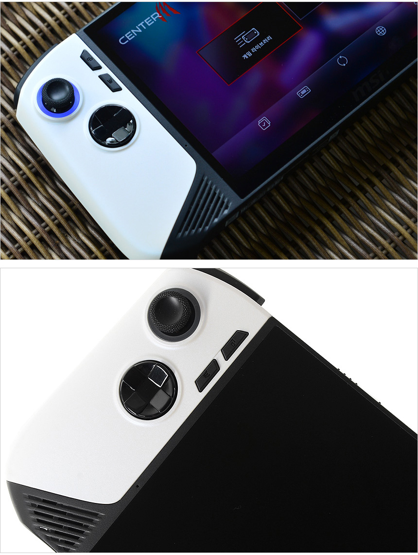 전면 좌측면의 모습으로 아날로그 스틱이 설치되어 있고 D패드가 부착된 것을 확인할 수 있다. 또한 MSI 센터 M 버튼과 보기 버튼 (앱이나 게임에 따라 매뉴얼기나 일시중지 등의 기능지원) 을 지원해 편의성을 높였다. 참고로 트리거와 조이스틱은 내구성을 높이기 위해 물리적인 접촉이 발생하지 않도록 설계했다. 먼지 오염등에도 강해 잦은 야외에서의 사용에도 안정적으로 작동한다.