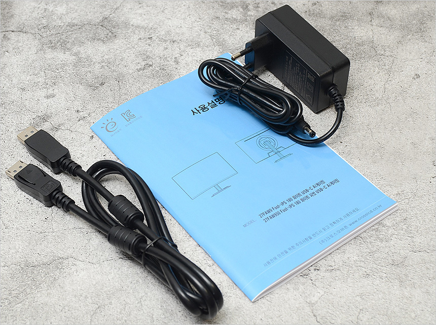 풀KIT 의 모습으로 PD충전을 위한 60W 전원 어댑터와 DP 케이블, 사용설명서가 제공된다.