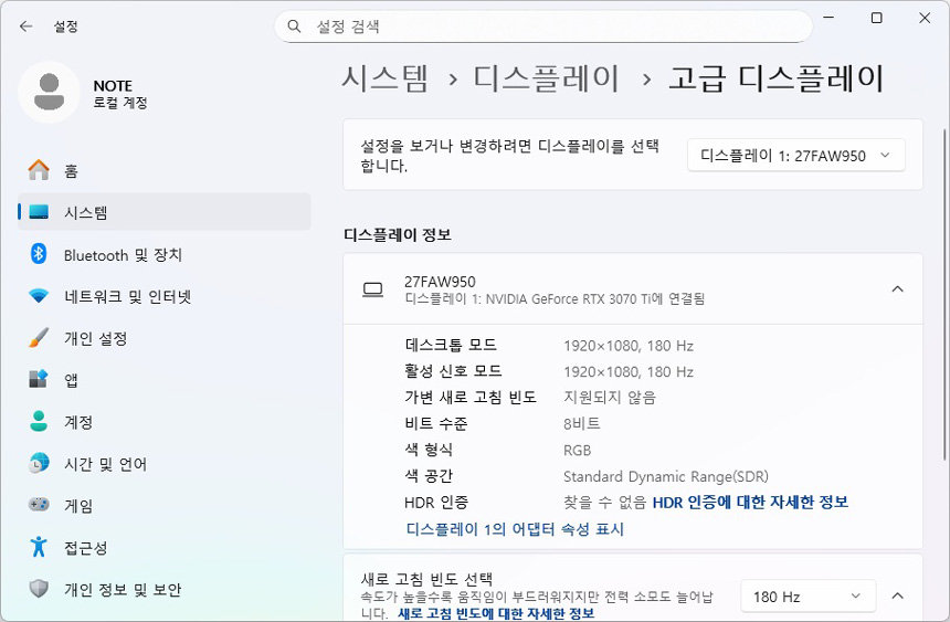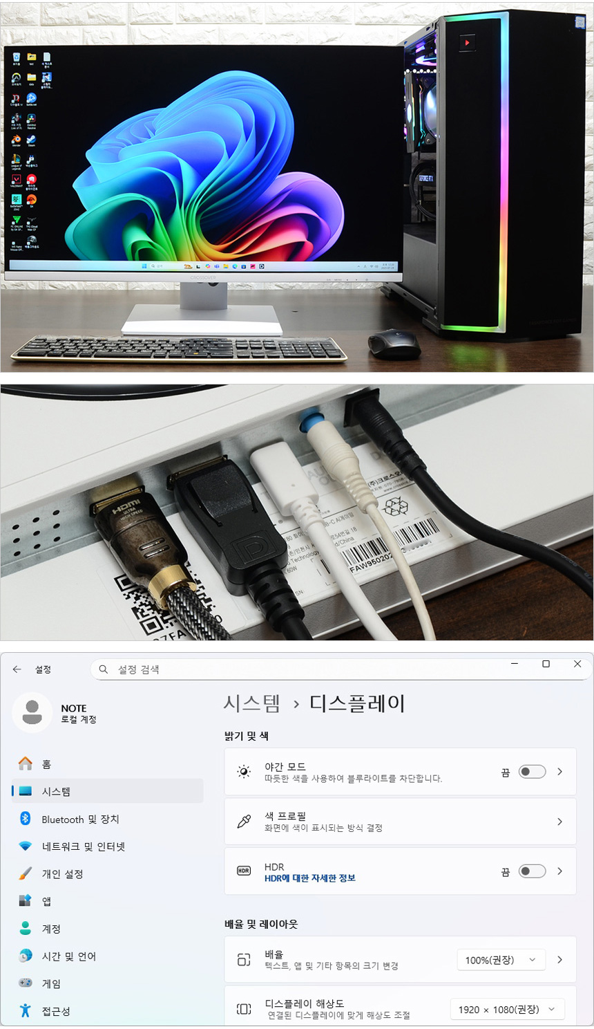 테스트를 위해 모니터와 PC를 책상에 설치한 모습으로 30형 이상의 대화면 모니터와 달리 많은 공간을 차지하지 않았다. 듀얼 모니터로 셋팅해도 일반 책상에 편하게 설치할 수 있을 것이다. 또한 HDR을 기본 지원하는 모델답게 디스플레이 설정에서 HDR 적용이 가능하다.