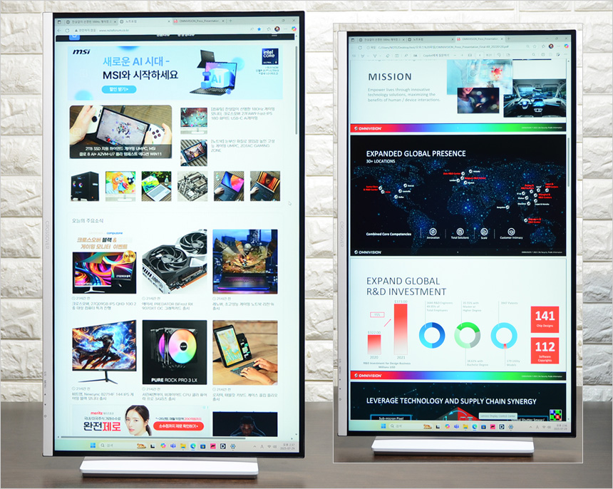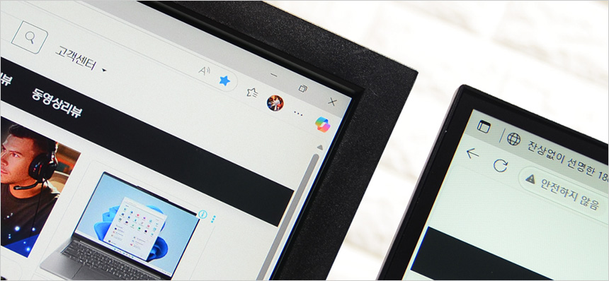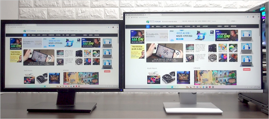 2대의 모니터를 셋팅한 김에 베젤 두께를 확인하고 있는 모습으로 확연한 차이를 보여주었다. 슬림 베젤이 적용된 모델로 높은 몰입감을 경험할 수 있을 것이다.