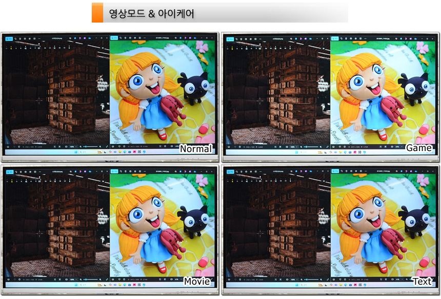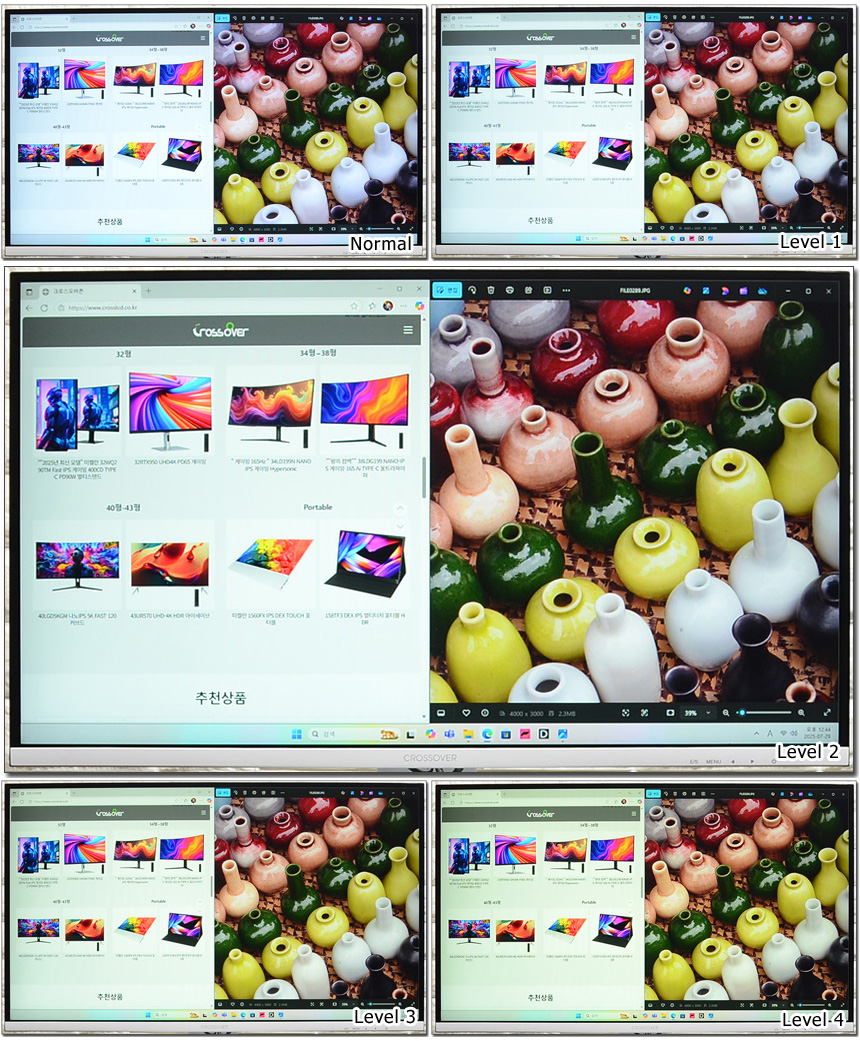 눈건강을 위해 다양한 기술을 지원한다. 상단의 사진은 눈건강을 해치는 블루라이트의 감소 기능을 테스트 하고 있는 모습으로 설정값에 따라 차이가 발생하는 것을 확인할 수 있다. (기존 모니터와 달리 색의 왜곡이 크지 않은점이 인상적이다.)