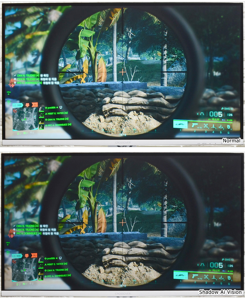 새도우 Ai 비전 기술이 적용되어 게임등에서 유용하게 활용할 수 있다. 밝기를 높여 암부 시인성을 개선하는 블랙레벨과 달리 과도하게 밝거나 이질적인 부분을 자연스럽게 조절하고 디테일을 개선해 영상 퀄리티를 높여주는 것을 확인할 수 있었다.