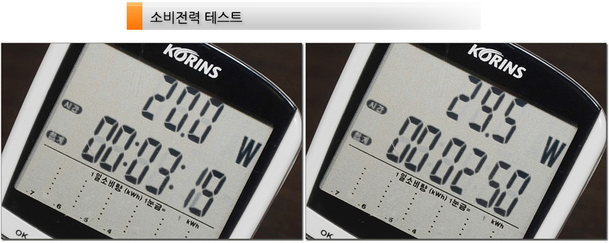 소비전력 테스트를 진행하고 있는 모습으로 대기모드에서는 0.5W, 50% 밝기에서 20W, 100% 밝기에서 29.5W 의 전력이 소비되는 것을 확인할 수 있었다.