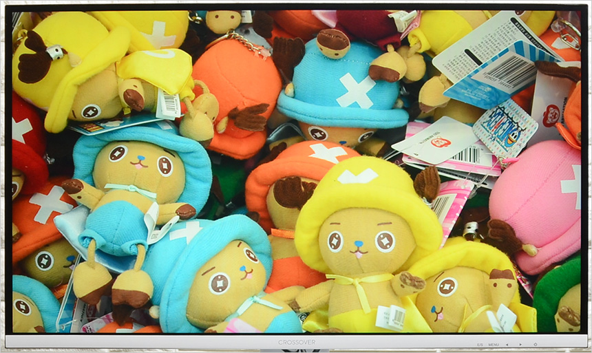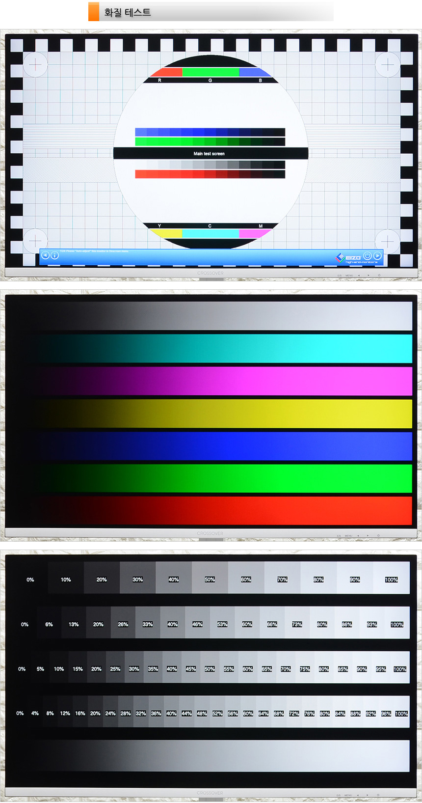 테스트 프로그램을 이용해 화질을 확인하고 있는 모습으로 IPS 패널 특유의 진한 색표현이 인상적이다. (VA 패널과는 분명한 차이를 느낄 수 있었다.) 특히 특정 원색 (레드) 이 튀는 느낌을 주는 구형 IPS 패널과 달리 원색이 지나치게 강렬하지 않은점이 마음에 든다. 게이밍에 특화된 모니터 지만 화질이 상당히 뛰어나기 때문에 심플한 디자인 작업도 편하게 실행할 수 있다. 또한 대부분의 IPS 패널 모니터와 같이 1,000 :1 의 명암비를 지원한다. 상단의 그레이스케일 차트는 완벽하게 구분할 수 있었다.