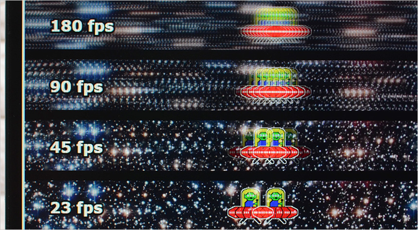 상단의 사진은 180Hz 의 높은 주사율을 쉽게 확인할 수 있도록 하위 프레임과 같이 재생되는 영상 (960 Pixel Per Sec) 을 셔터스피드 1/20 로 촬영한 모습으로 프레임이 낮을수록 캐릭터의 수가 적으며 프레임이 높아질수록 시간당 많은 화면이 뿌려지기 때문에 캐릭터의 수가 많은 것을 확인할 수 있다. 직접 눈으로 영상을 볼 경우 180Hz 의 경우 무척 자연스럽게 UFO 가 이동한다.