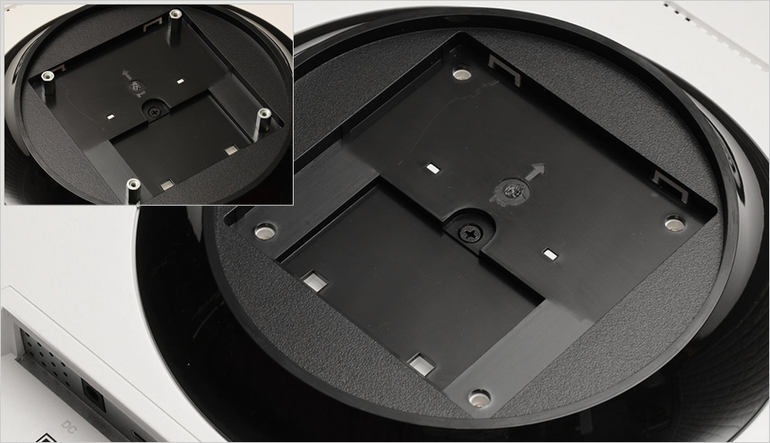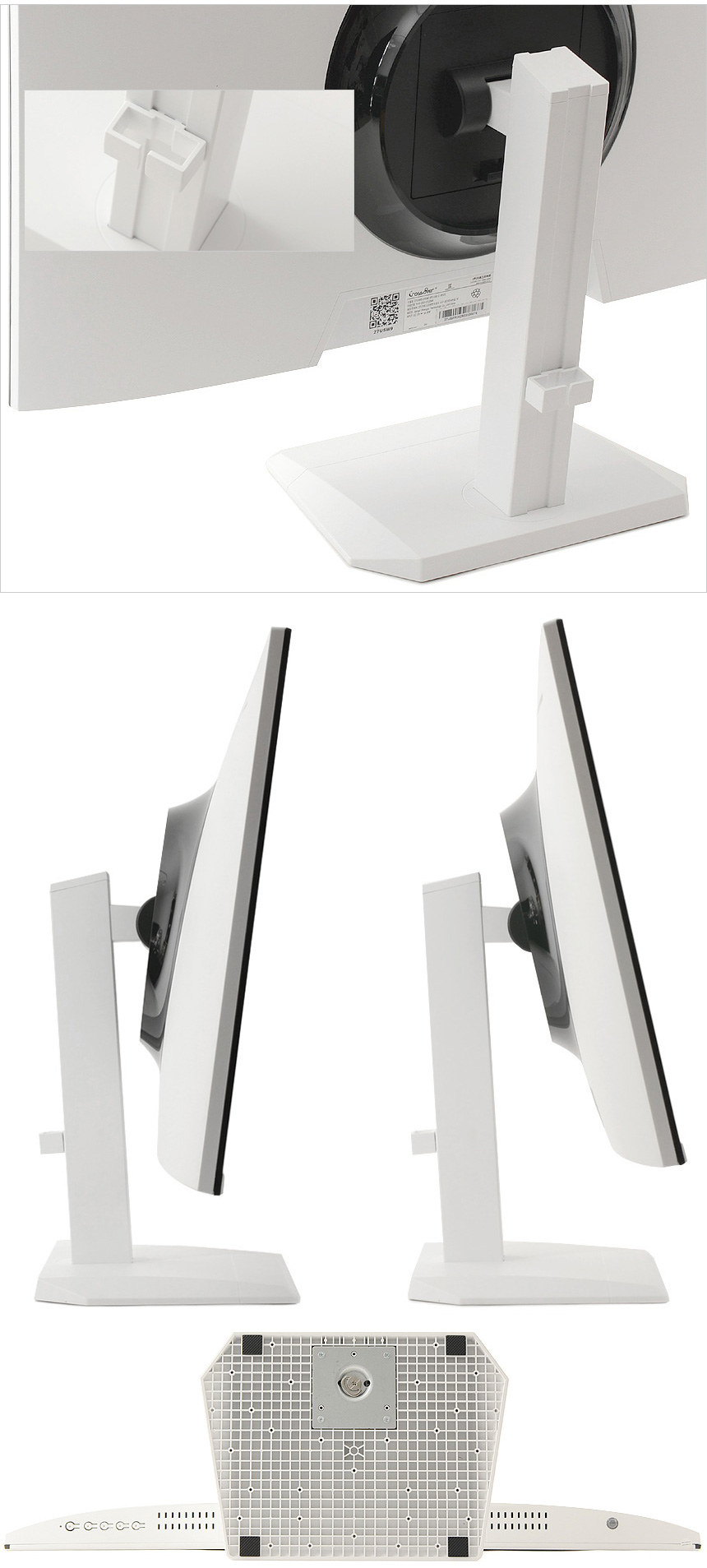 스탠드의 모습으로 하단 중앙에 케이블 정리를 위한 가이드가 설치된 것을 확인할 수 있으며 바닥면에는 고무패드가 부착되어 미끄러짐을 미연에 방지한다. 또한 틸트를 지원해 사용자에 맞게 모니터 각도를 조정할 수 있다.