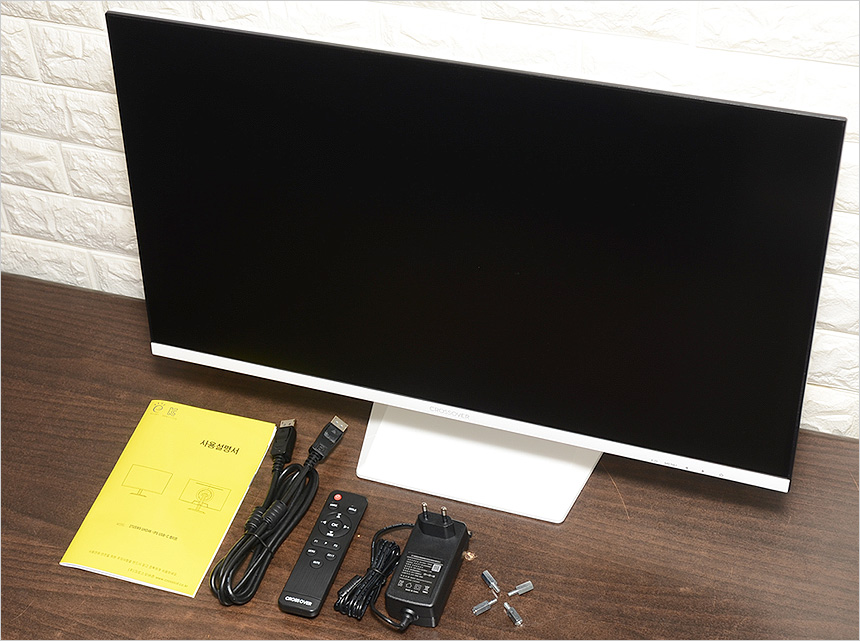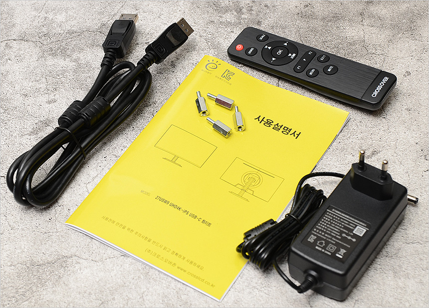 풀KIT 의 모습으로 15W PD충전을 지원하는 모니터 답게 60W 전원 어댑터를 제공하며 DP 케이블과 무선 리모콘, 설명서, 베사 연장볼트가 포함된 것을 확인할 수 있다.