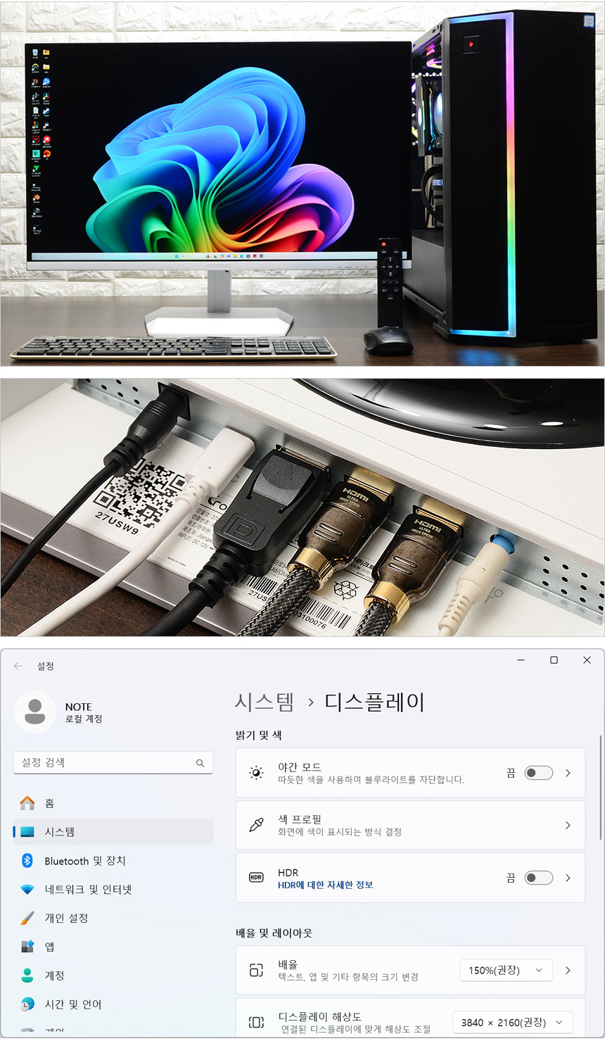 화질 테스트를 진행하고 있는 모습으로 4K 특유의 뛰어난 디테일이 인상적이었으며 (픽셀이 눈에띄는 저해상도 모델들과는 완전히 다른 모습을 보여주었다.) 프리미엄 IPS 패널 특유의 진한 색감도 무척 마음에 들었다. 이 제품은 패널의 퀄리티가 떨어지는 일부 가성비 4K 모니터와 달리 10억 7천만 컬러에 sRGB 145%, DCI-P3 103%, AdobeRGB 100% 의 색 재현력과 김환교수의 프로파일도 제공해 전문작업용으로 유용하게 활용할 수 있다.
