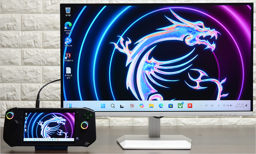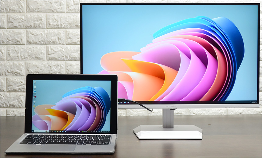 C타입 단자를 지원해 C타입 디스플레이 출력을 지원하는 노트북과 편하게 연결할 수 있었다. 노트북의 화면크기가 작아 작업이 힘들 경우 사진과 같이 연결해 메인 디스플레이로 활용할 수 있으며 게이밍 UMPC 등과 연결해 대화면으로 게임을 즐기거나 영상을 즐길 수 있다.