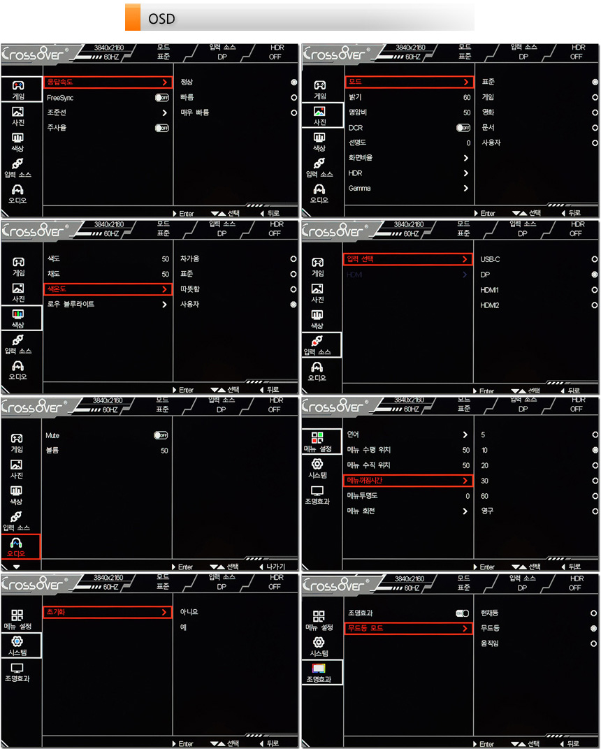 OSD의 UI가 세련되게 변신한 것을 확인할 수 있다. 게임전용 메뉴가 제공되며 명암과 밝기를 비롯해 다양한 설정을 제공해 사용자에 맞게 모니터를 셋팅할 수 있다. 특히 리모콘 지원으로 편의성을 높였으며 다양한 핫키를 제공해 주요 기능을 빠르게 설정할 수 있다. (동영상을 참조하기 바란다.)