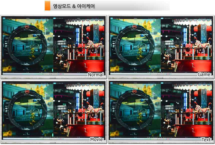 다양한 화면모드 지원으로 컨텐츠에 최적화된 영상을 즐길 수 있다. 상단의 사진은 지원 모드를 비교한 모습으로 (표준 밝기 50) 밝기가 확연하게 달라지는 것을 확인할 수 있었다. (리모콘에서 핫키를 지원해 게임이나 작업중 손쉽게 모드를 변경할 수 있다.)