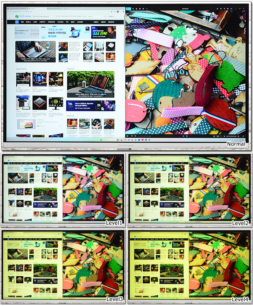 눈건강을 해치는 블루라이트의 감소 기능을 테스트 하고 있는 모습으로 설정값에 따라 차이가 발생하는 것을 확인할 수 있다. (리모콘에서 핫키를 지원해 빠른 설정이 가능하다.)