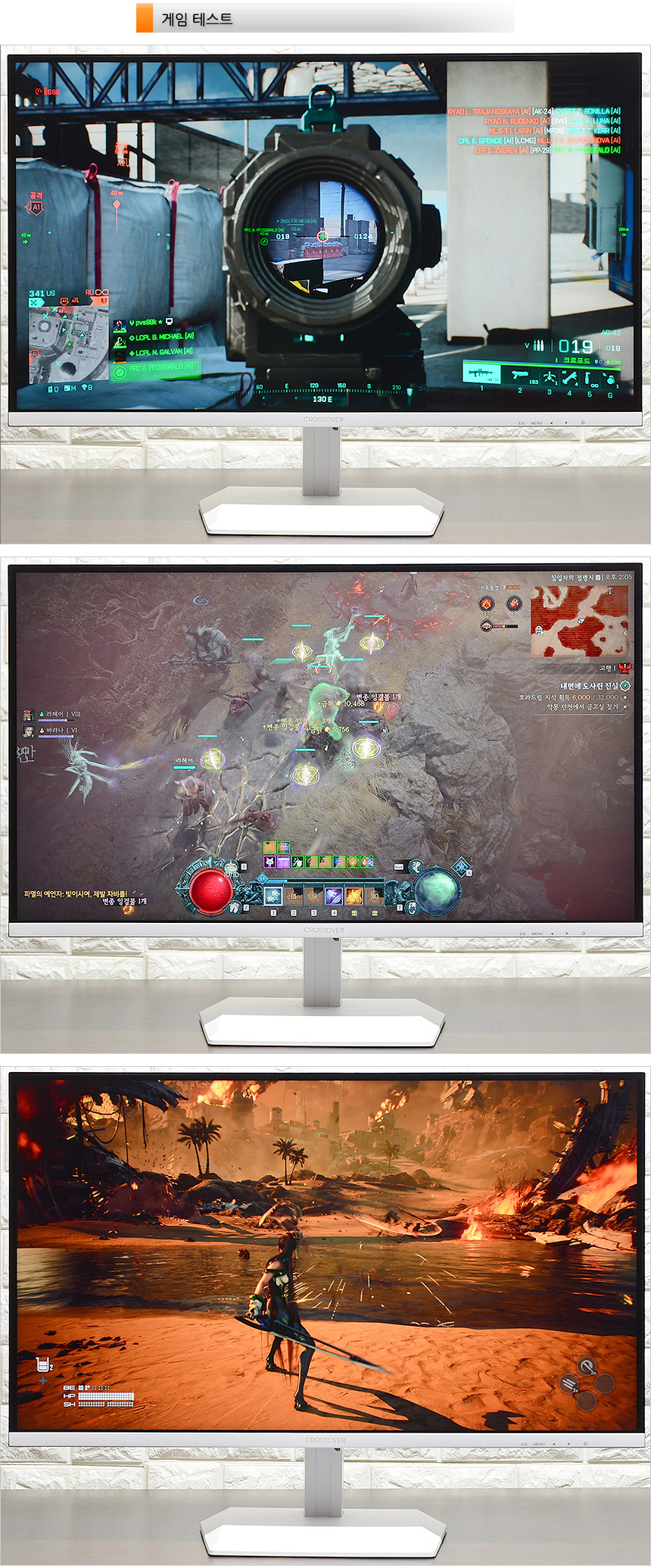 60Hz 주사율을 지원해 FPS 게임용으로는 적합하지 않다. 하지만 일반 모니터를 압도하는 뛰어나 화질과 다양한 게임관련 기술 지원으로 일반 게임용으로는 충분히 활용할 수 있다. 조준선을 지원해 사격 정확성을 높일 수 있었으며 5ms 응답속도 지원으로 잔상으로 인한 스트레스도 없었다. 물론 144나 165Hz 모니터와 같은 부드러움은 경험할 수 없었지만 뛰어난 화질로 충분히 보상받을 수 있을 것이다.