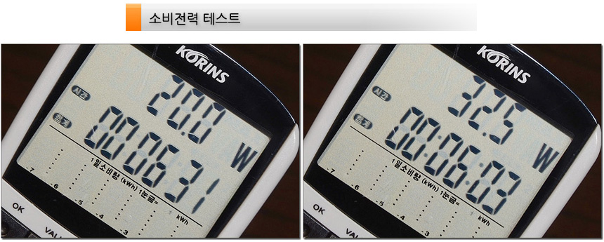 소비전력 테스트를 진행하고 있는 모습으로 100% 밝기에서는 32.5W 소비전력을 보여주었으며 50% 밝기에서는 20W로 소비전력이 낮아지는 것을 확인할 수 있었다. 전기세 걱정없이 사용할 수 있는 모델이다.