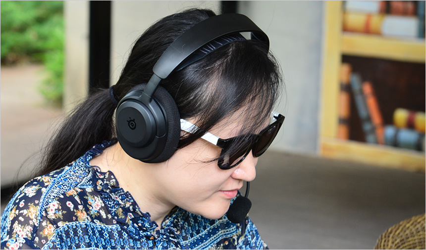 착용감 테스트를 진행하고 있는 모습으로 가벼움을 장점으로 내세우는 모델답게 무게로 인한 목이나 머리의 부담이 크지 않은 것을 확인할 수 있었다. 음강용 헤드폰과 달리 장시간 착용하고 있어야 하기 때문에 무게가 상당히 중요한데 이 제품은 비슷한 스펙의 동급 제품대비 가벼운 무게로 편하게 착용하고 게임등을 즐길 수 있다.
