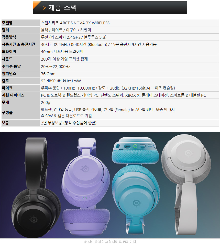 컬러 선택이 제한적인 일반 게이밍 헤드셋과 달리 사진과 같이 블랙 / 화이트 / 아쿠아 / 라벤더 등의 다양한 컬러로 출시되어 취향에 따라 제품을 선택할 수 있으며 파스텔톤의 게이밍 데스크를 세팅할 수 있다. 리뷰를 진행하는 스틸시리즈 ARCTIS NOVA?3X?WIRELESS 의 경우 XBOX 를 지원하는데 반해 스틸시리즈 ARCTIS NOVA?3P?WIRELESS 는 XBOX를 지원하지 않는다. 구입시 이점 참조하기 바란다.
