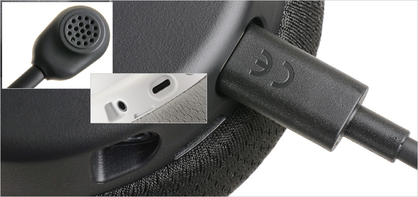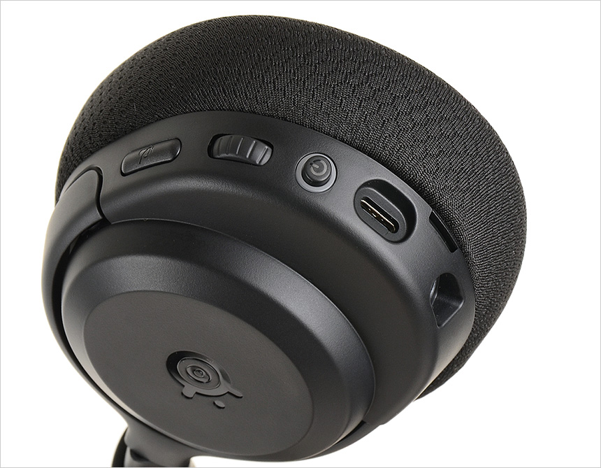 기본 제공되는 단자와 버튼의 모습으로 마이크 ON/OFF와 볼륨조정 다이얼이 설치되어 있으며 전원 버튼과 LED를 지원한다. 참고로 전원 버튼은 블루투스 페어링 뿐만 아니라 2.4GHz 와 블루투스를 변환하는 기능도 제공한다. 측면에는 충전을 위한 C타입 단자가 설치되어 있고 마이크 연결을 위한 단자도 준비된 것을 확인할 수 있다.
